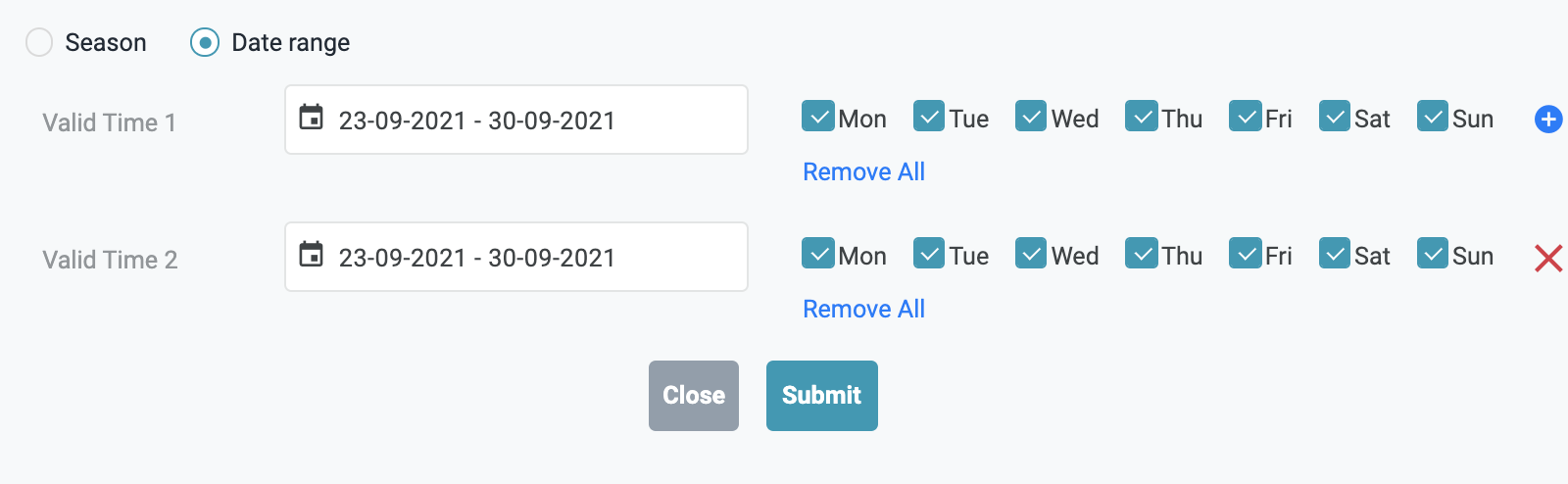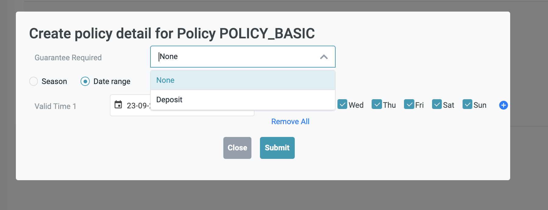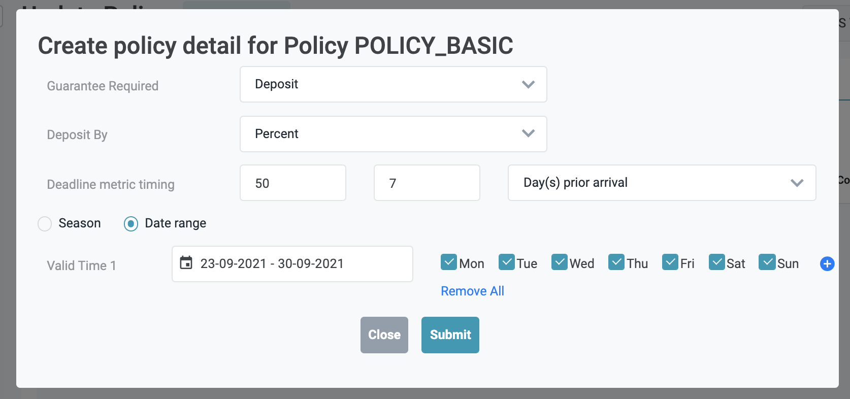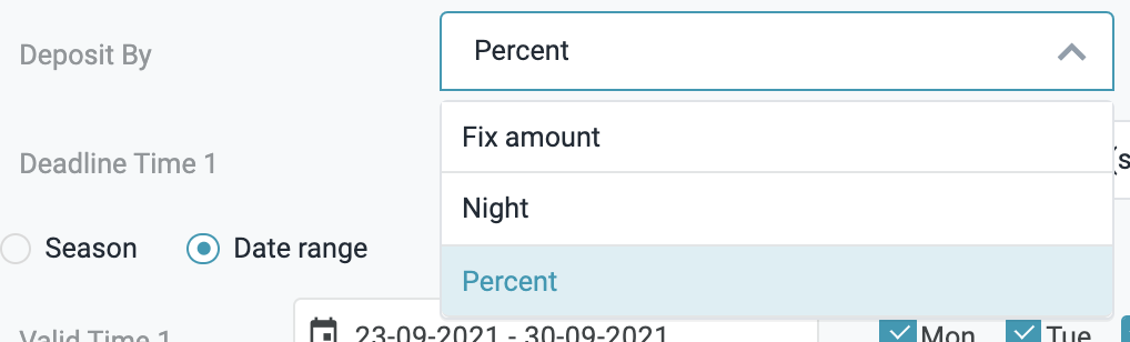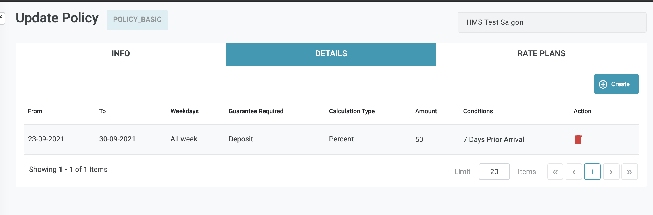 ![]() Time Range - Khoảng thời gian áp dụng chi tiết cài đặt chính sách này. Có thể cài đặt 1 khoảng thời gian tuỳ biến hoặc chọn theo mùa vụ được cài đặt tại tính năng Season. Cách cài đặt khoảng thời gian cũng có thể được áp dụng theo ngày trong tuần, nhiều khoảng thời gian khác nhau, tuy nhiên, chi tiết các khoảng thời gian áp dụng của 1 chính sách bảo đảm sẽ không được xung đột hoặc gối lên nhau. ![]() Ví dụ: Bạn muốn tạo chính sách bảo đảm với chi tiết yêu cầu khách đặt phòng phải thực hiện đảm bảo bằng 50% giá trị đặt phòng 7 ngày trước ngày nhận phòng, chi tiết sẽ như sau: ![]() Sau khi thêm chi tiết thành công, màn hình chi tiết Chính sách sẽ có thêm 1 mục chi tiết theo khoảng thời gian và các công thức áp dụng ![]() Bạn cũng có thể tạo thêm chi tiết Chính sách cho 1 khoảng thời gian tiếp nối sau đó để đảm bảo vận hành trơn tru, hoặc bạn cũng có thể quy định nhiều mùa vụ trong năm để dễ dàng cài đặt nhanh nhiều khoảng thời gian áp dụng chính sách bảo đảm khác nhau. ![]() [Tab Rate Plans] - Thông tin các gói mã giá áp dụng Chính Sách Bảo đảmMàn hình chi tiết chính sách bảo đảm → Tab Rate Plans ![]() Bấm Assign Rate Plan (Gán kế hoạch giá) ![]()