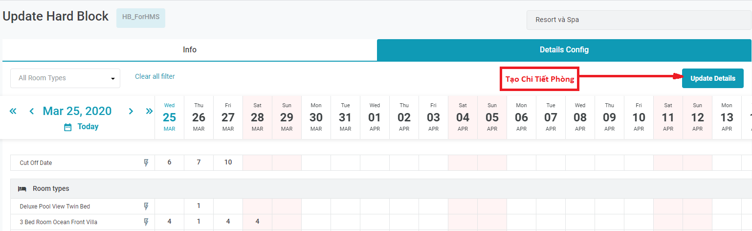 [Tab Detail Configs] - Tạo chi tiết phòng cho Quỹ phòng cố địnhChọn Update Details để tạo chi tiết phòng cho quỹ phòng cố định ![]() ![]() Nhập các thông tin được yêu cầu: