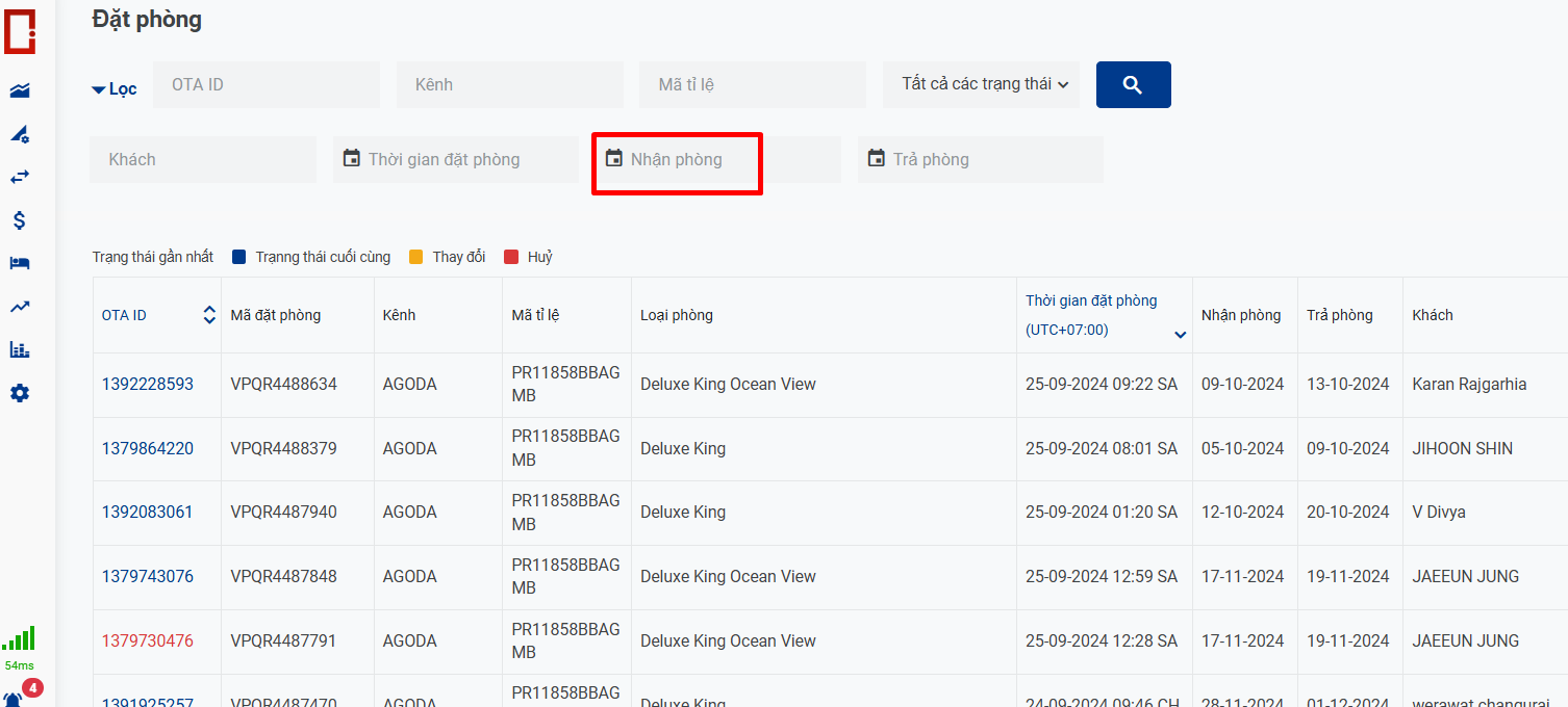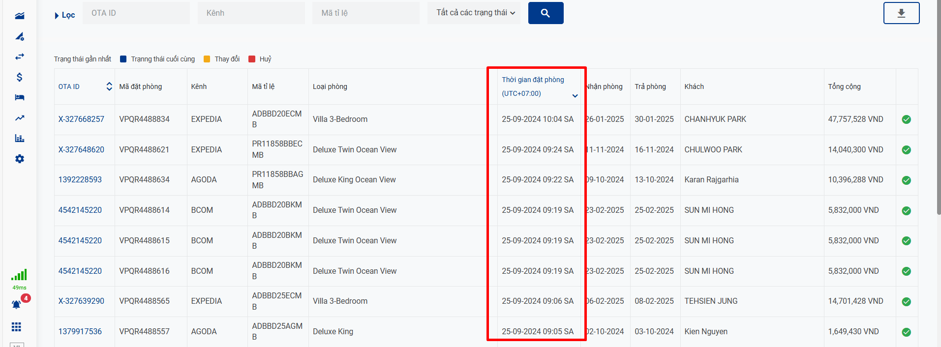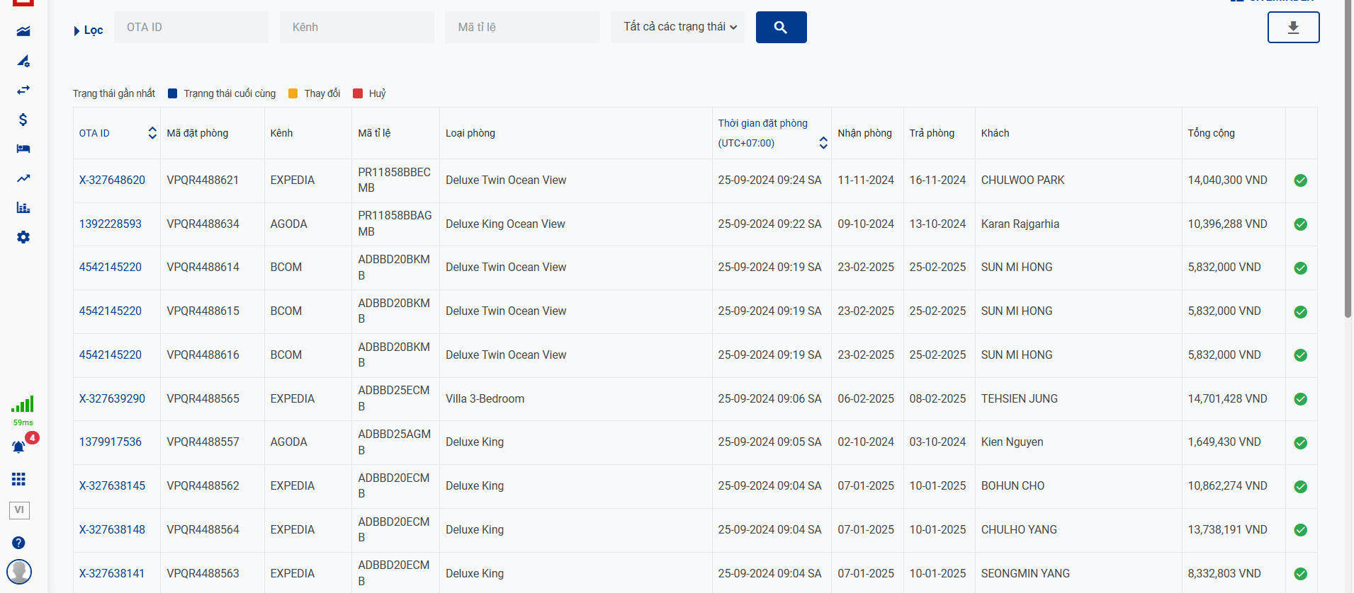 Hướng dẫn quản lý đặt phòng. Màn hình này hiển thị danh sách đặt phòng đến từ các kênh phân phối.