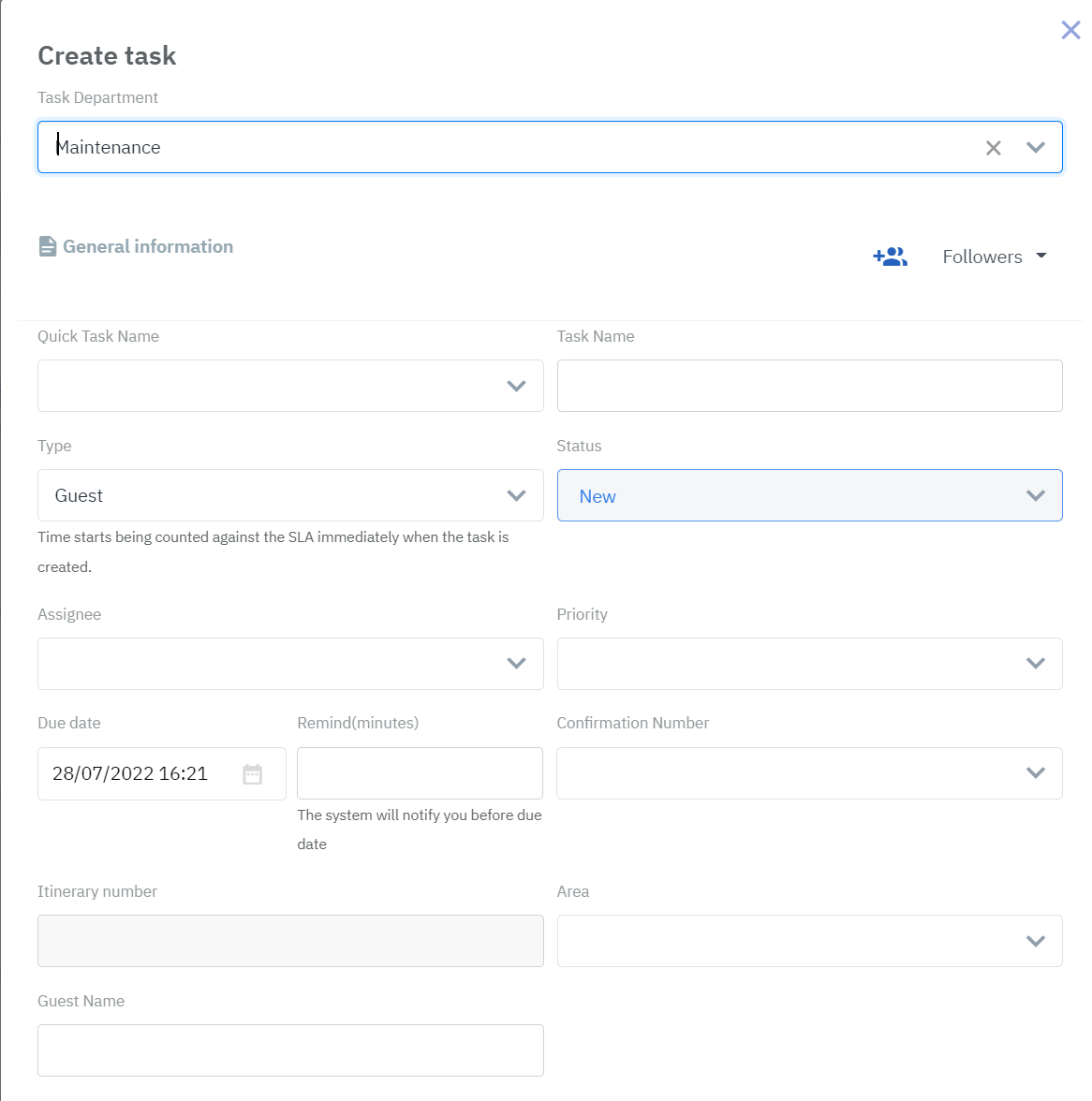 • SLA ( Phút/ Minute ): thời gian dự kiến để hoàn thành nhiệm vụ theo tiêu chuẩn của khách sạn ( có quy định rõ cho từng công việc tương ứng, người dùng khi tạo công việc sẽ nhập thời gian đúng theo quy định )
