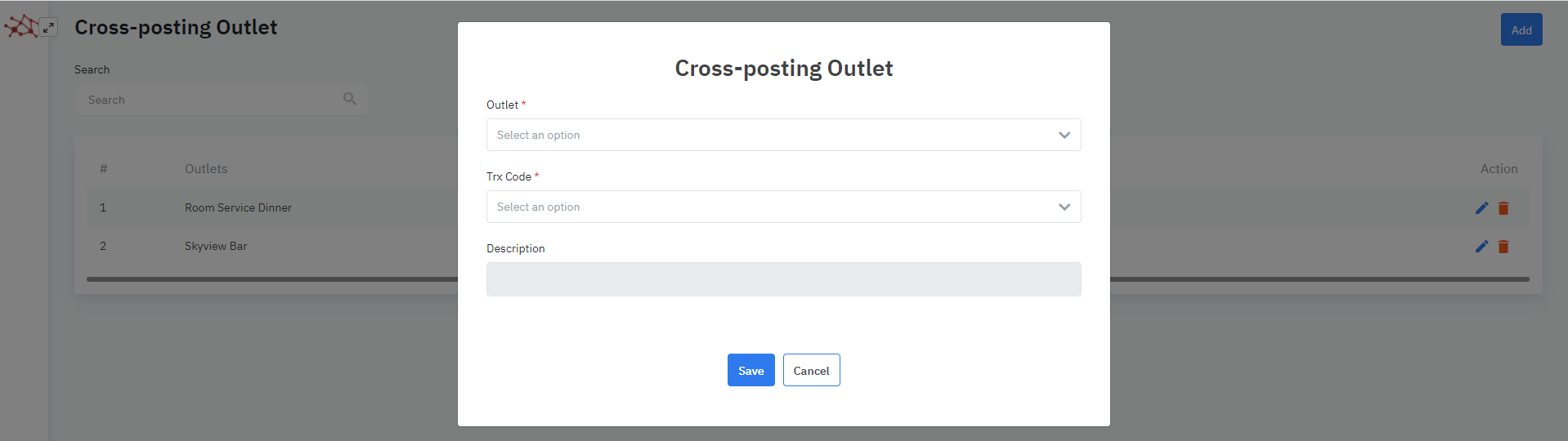 Log in – Configurations - Trx Code Settings - Cross-posting Outlet |