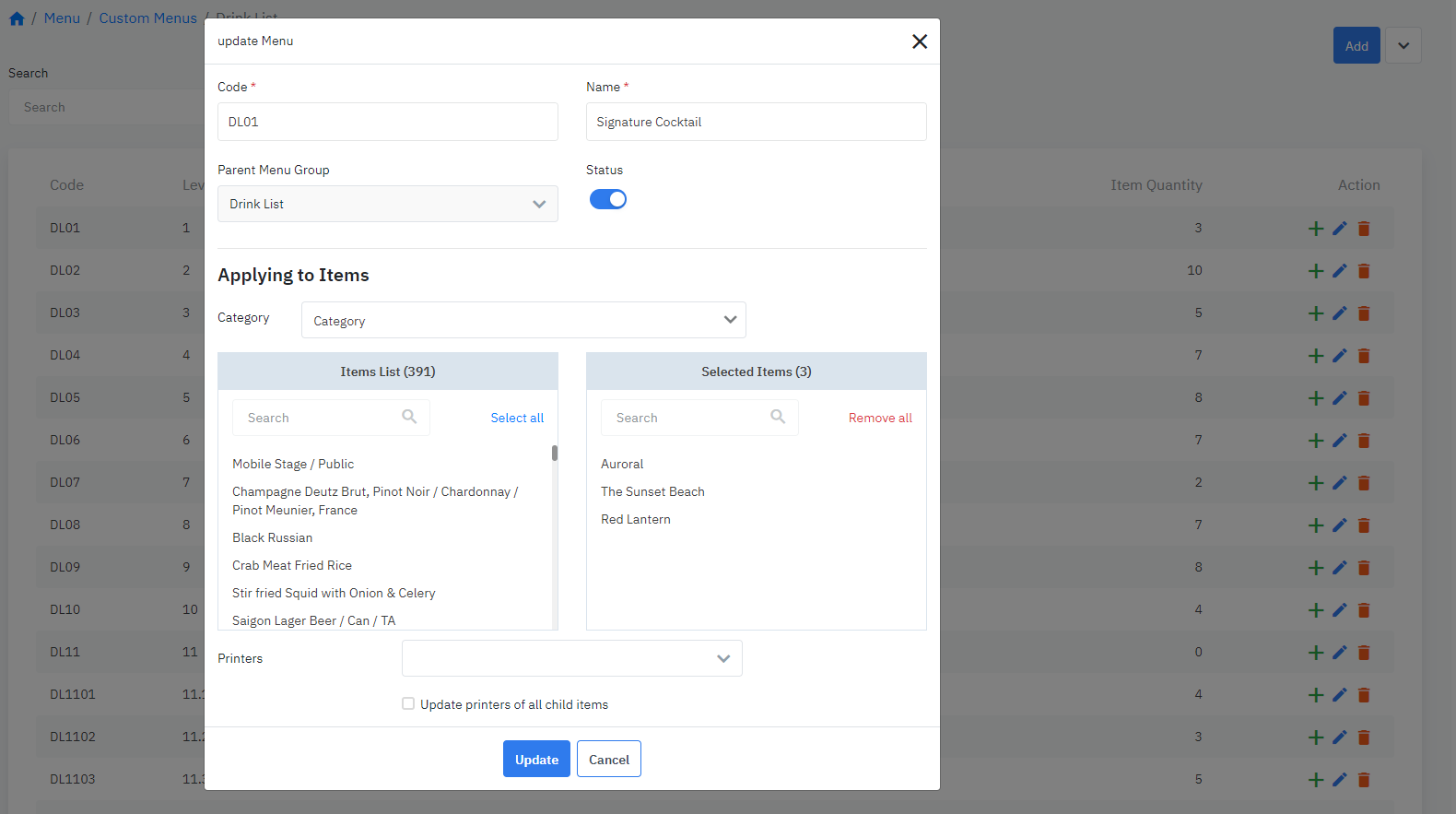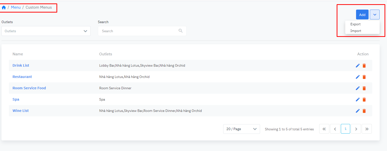 Danh sách và thông tin các Menu của toàn cơ sở |