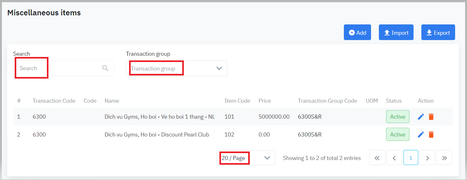 ![]() Có thể tìm kiếm dịch vụ thông qua ô tìm kiếm với từ khóa Có thể lọc các dịch vụ bằng nhóm mã giao dịch Cho phép điều chỉnh số lượng dịch vụ hiển thị trên 1 trang Thêm mới một dịch vụ/ Chỉnh sửa một dịch vụ![]() ![]()