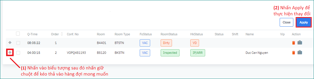 Chỉnh sửa vị trí ưu tiên của từng phòng/Edit Order![]() Màn hình tìm kiếm các phòng đang trong danh sách đợi![]()
