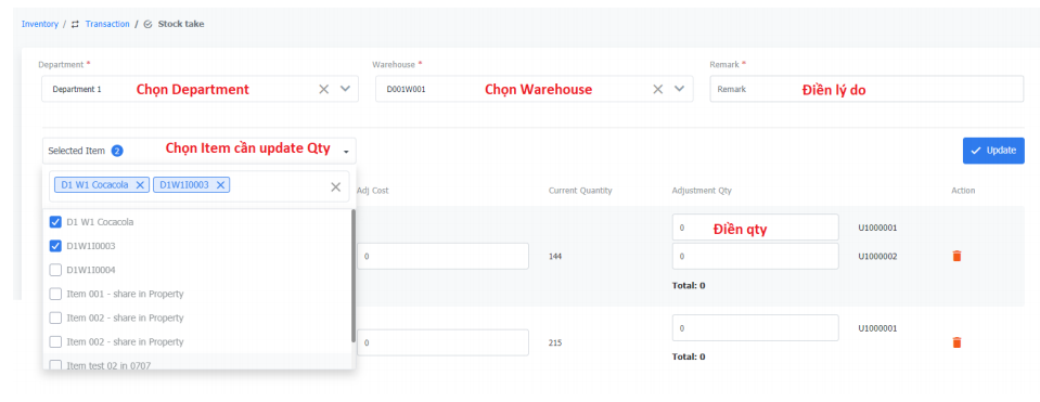 Sử dụng để nhập số dư tồn đầu kỳ của hàng hóa khi bắt đầu vận hành hệ thống Danh sách Department/ Warehouse được hiển thị theo quyền của User (khai báo ở màn hình User-Warehouse) Danh sách hàng hóa sẽ được hiển thị theo Warehouse đã chọn Số lượng hàng hóa sẽ đi theo Warehouse Chỉ cho phép kiểm kê 1 kho 1 thời điểm Có thể chọn kiểm kê một hoặc nhiều mặt hàng trong kho cùng một lúc Số lượng tổng 1 mặt hàng trong kho sẽ được update ngay lập tức ở thời điểm Save và bằng số lượng được kiểm kê ở màn hình này Số lượng trong kho sẽ được quy đổi ra Giá trị quy đổi cơ bản (quy đổi = 1) |
