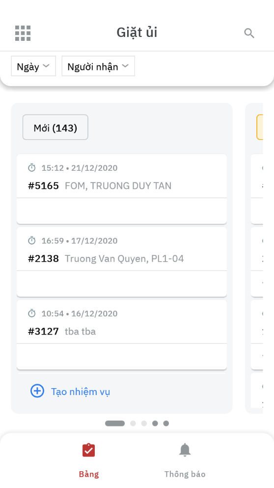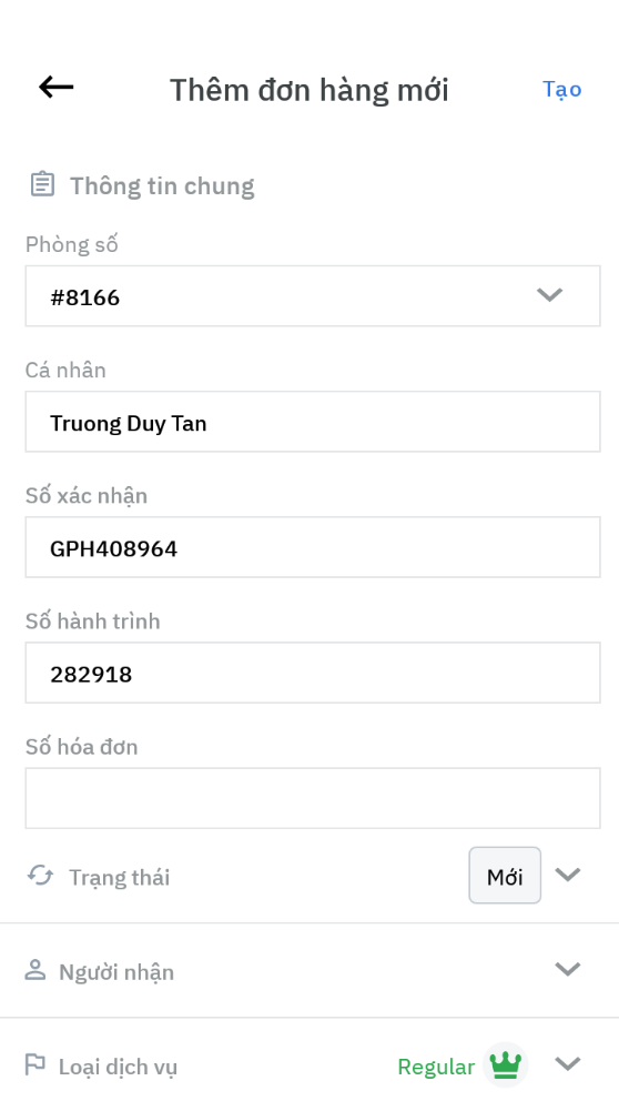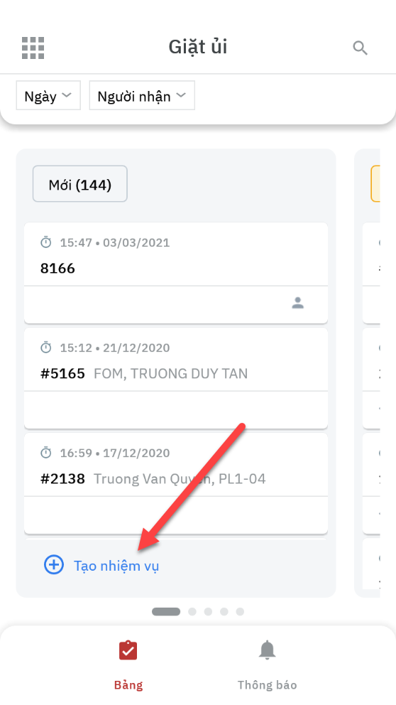 Từ màn hình Giặt ủi, bấm vào mục Tạo mới nhiệm vụ để tạo mới hóa đơn giặt là: ![]() Tiến hành nhập thông tin ở cho nhiệm vụ giặt là: ![]() Phòng số: Nhập số phòng của khách, các thông tin của khách ở phòng này sẽ tự động hiện lên cho các ô Tên Khách, Số xác nhận, số hành trình và Ngày khách lưu trú tại cơ sở. ![]() Số hóa đơn: Nhập số hóa đơn của bill laundry khách đã điền số lượng và ký tên Người nhận: Nhập thông tin người đi nhận đồ để giặt. Loại dịch vụ: