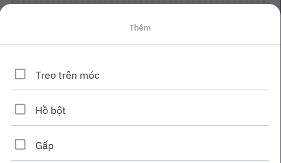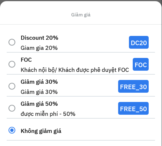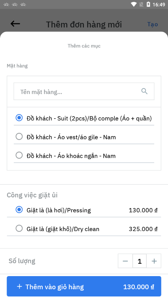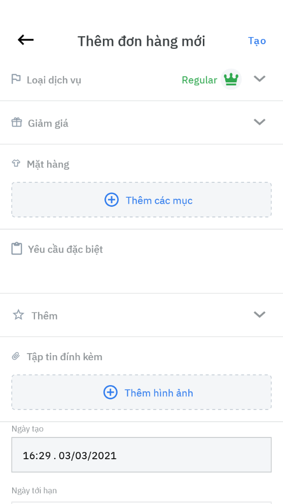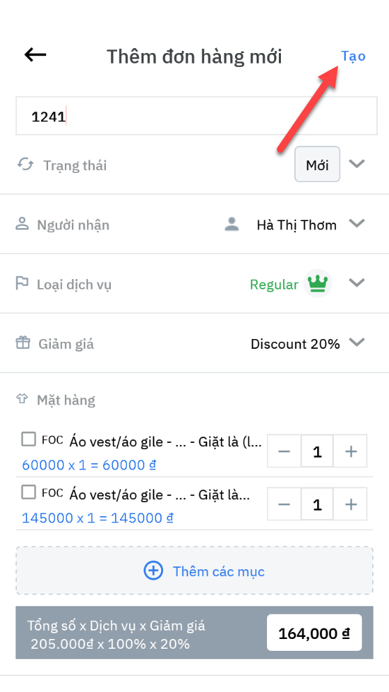 ![]() Sau khi nhập thông tin ở các trường thông tin trên, kéo xuống dưới sẽ có các trường thông tin tiếp theo như dưới đây: ![]() Giảm giá: Chọn các hình thức giảm giá nếu khách được hưởng ![]() Thêm: các yêu cầu đặc biệt thêm vào nhiệm vụ như: treo trên móc, hồ bột, gấp ![]() Tập tin đính kèm: chụp các hình ảnh liên quan và đính kèm vào nhiệm vụ: hình quần áo khách, hình hóa đơn giặt là. | ![]() Căn cứ theo hình chụp bill vật lý và đồ khách thực tế. Người dùng tiến hành nhập thông tin. Nếu món đồ của khách được miễn phí thì tích vào mục FOC như hình dưới: ![]() | ![]() Kiểm tra lại thông tin, sau đó tích vào mục Tạo để hoàn thành tạo hóa đơn giặt là. |