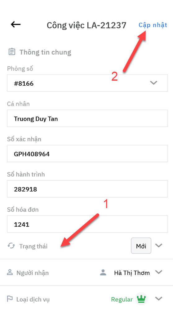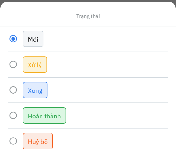 Các nhiệm vụ giặt là mới: ![]() Các nhiệm vụ giặt là đang xử lý: ![]() | ![]() Từ màn hình giặt là, bạn mở một nhiệm vụ cần cập nhât, màn hình Công việc chi tiết hiện lên như ở bên trên. Bạn có thể cập nhật thông tin cho các mục. Nếu nhiệm vụ này có thay đổi trạng thái thì tích vào mục trạng thái và chọn các trạng thái tương ứng dưới đây: ![]() Giải thích các trạng thái: