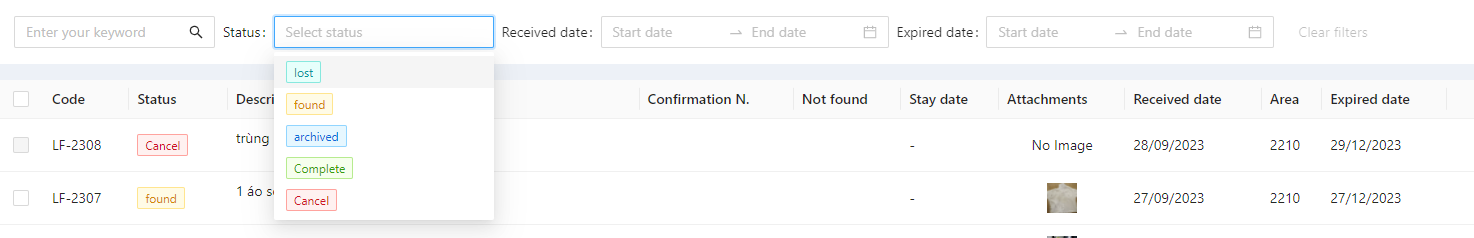 Danh sách các vật được tìm thấy trong khuôn viên khách sạn hoặc khách báo mất. Cho phép theo dõi các vật dụng mất và tìm thấy cũng như thêm mới. |
