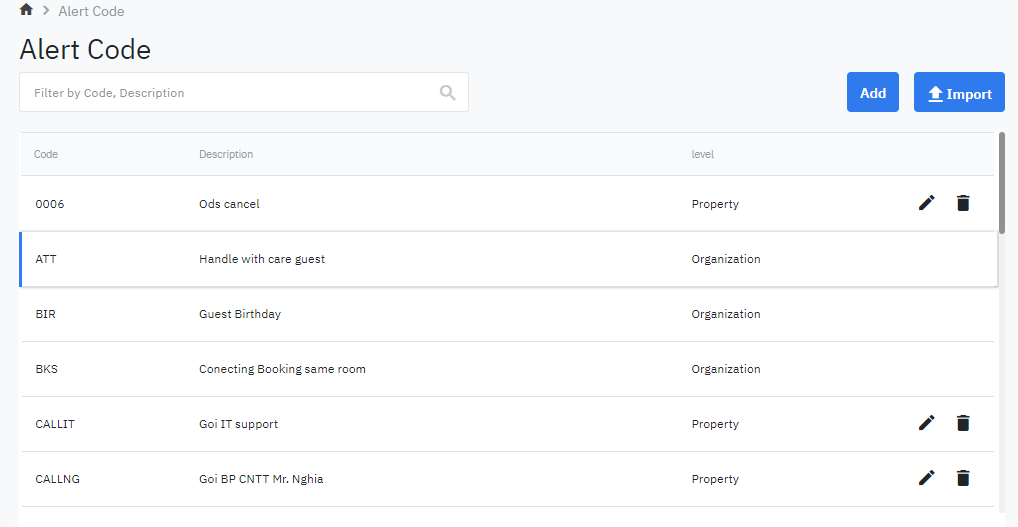 Danh mục các mã cảnh báo phục vụ cho chức năng Alert, hiển thị cảnh báo khi khách Check-in, Check-out và cập nhật thông tin đặt phòng |