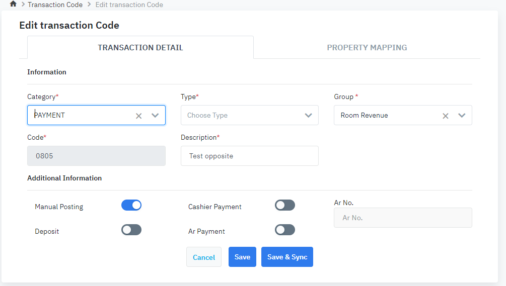 Log in – Applications - PMS Configuration – Master Data – Organization – Transaction Code |