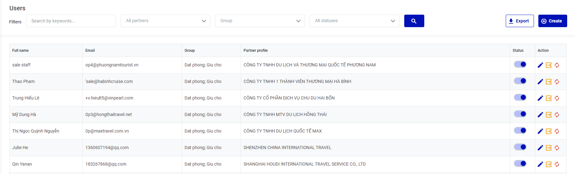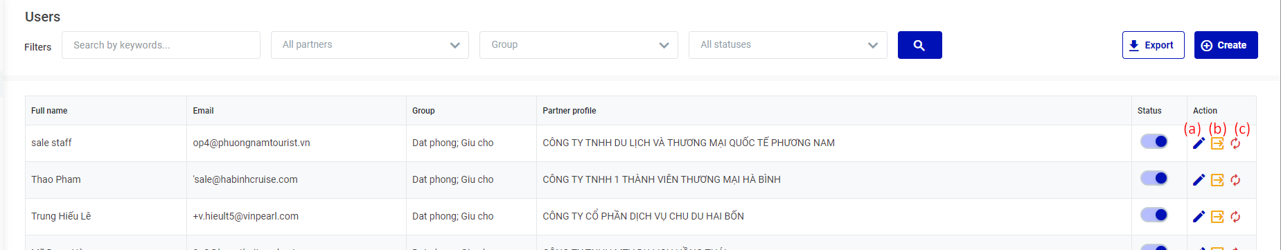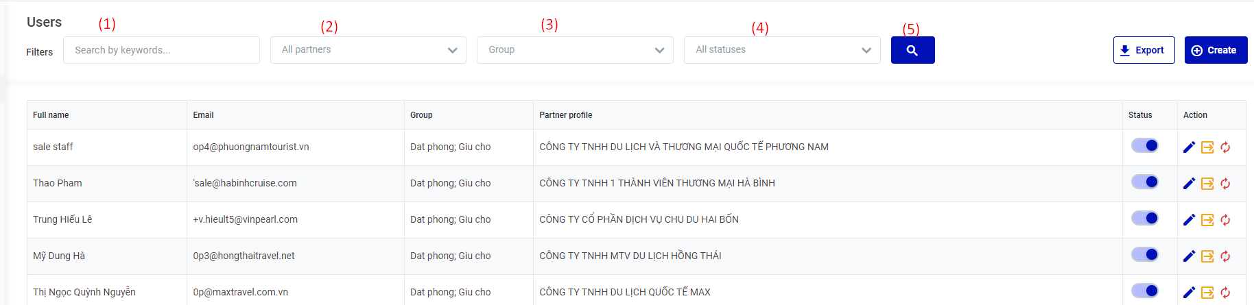 ![]() (1) Tìm kiếm theo email người dùng (2) Tìm kiếm theo tên Công ty (3) Tìm kiếm theo Group phân quyền (4) Tình trạng hoạt động (5) Bấm Lọc/Filter |