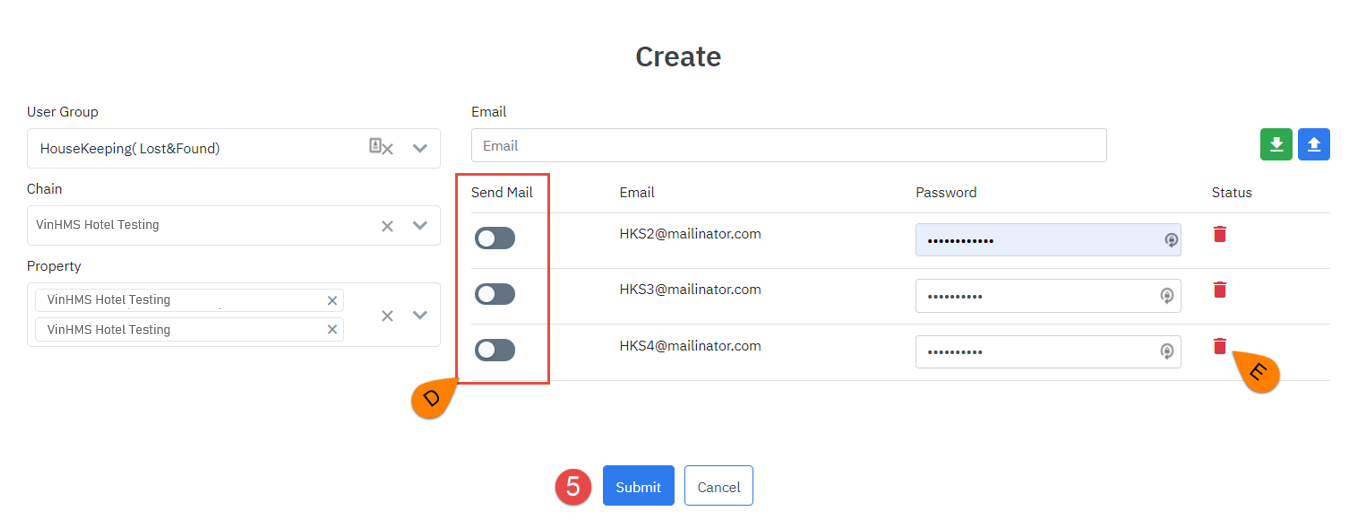 ![]() B1. Chọn Nhóm người dùng/User Group cho User: trường thông tin này thường sẽ được tạo trước khi tạo User, tham khảo ý nghĩa và cách tạo “Tại đây” B2. Chọn Chuỗi/Chain khách sạn: tham khảo ý nghĩa và cách tạo “Tại đây” B3. Chọn các khách sạn cho phép User truy cập B4. Có 2 cách để Thêm email của người dùng ![]() A. Nhập trực tiếp lên hệ thống B & C . Tải file excel Template (B), nhập thông tin email, và password vào file >> Nhập/Import (C) file excel đã update lên hệ thống. o D. Click Bật, hệ thống sẽ gửi email thông báo đến User về Thông tin đăng nhập (Email, password). o E. Xóa email ra khỏi danh sách B5. Gửi đi/Submit hoặc Hủy/Cancel |