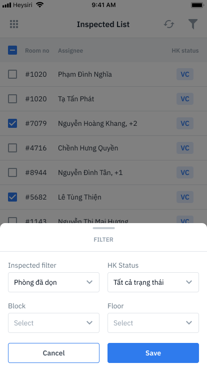 Màn hình này giúp cho Quản lý kiểm soát được các phòng Nhân viên HK đã dọn phòng xong kéo sang Done, và kiểm tra những phòng trống để đảm bảo phòng thực sự đã sạch và đủ đồ dùng chưa. | 1) Tick chọn phòng thực hiện kiểm tra >> (2) Inspected >> (3) Chọn trạng thái sau khi kiểm tra phòng >> (4) Save Trường hợp chọn Dirty sẽ yêu cầu nhập lý do để nhân viên nắm. | Danh sách kiểm phòng sẽ sử dụng chung cho tất cả Sup. Sup đi kiểm phòng có thể filter theo phân công của mình. |