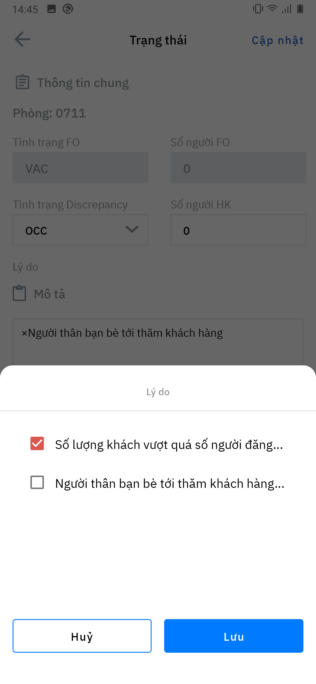 Trường hợp Quản lý đi kiểm tra thấy phòng FO ghi nhận là VAC (Phòng trống), nhưng thực tế khách vẫn còn ở, sẽ thực hiện chuyển đổi trạng thái như sau: (1) Click chọn vào phòng cần đổi trạng thái >> (2) Cập nhật tình trạng kiểm tra thực tế và Note nguyên nhân (phần Note không được để trống) >> (3) Update/ Cập nhật. |