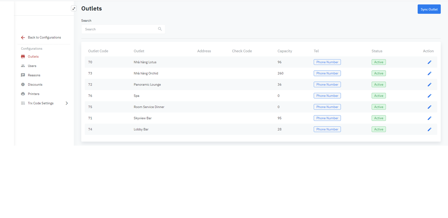 Sync OutletThực hiện đồng bộ thông tin các Outlet được khai báo ở phân hệ Property Management Danh sách các Outlet đã khai báo