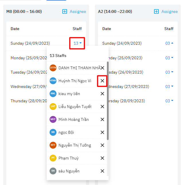 ![]() Người dùng còn có thể hủy phân công cho nhân viên dọn phòng theo từng ca làm việc bằng cách