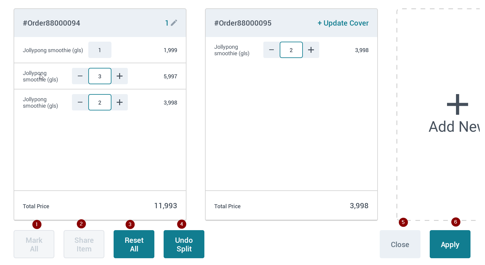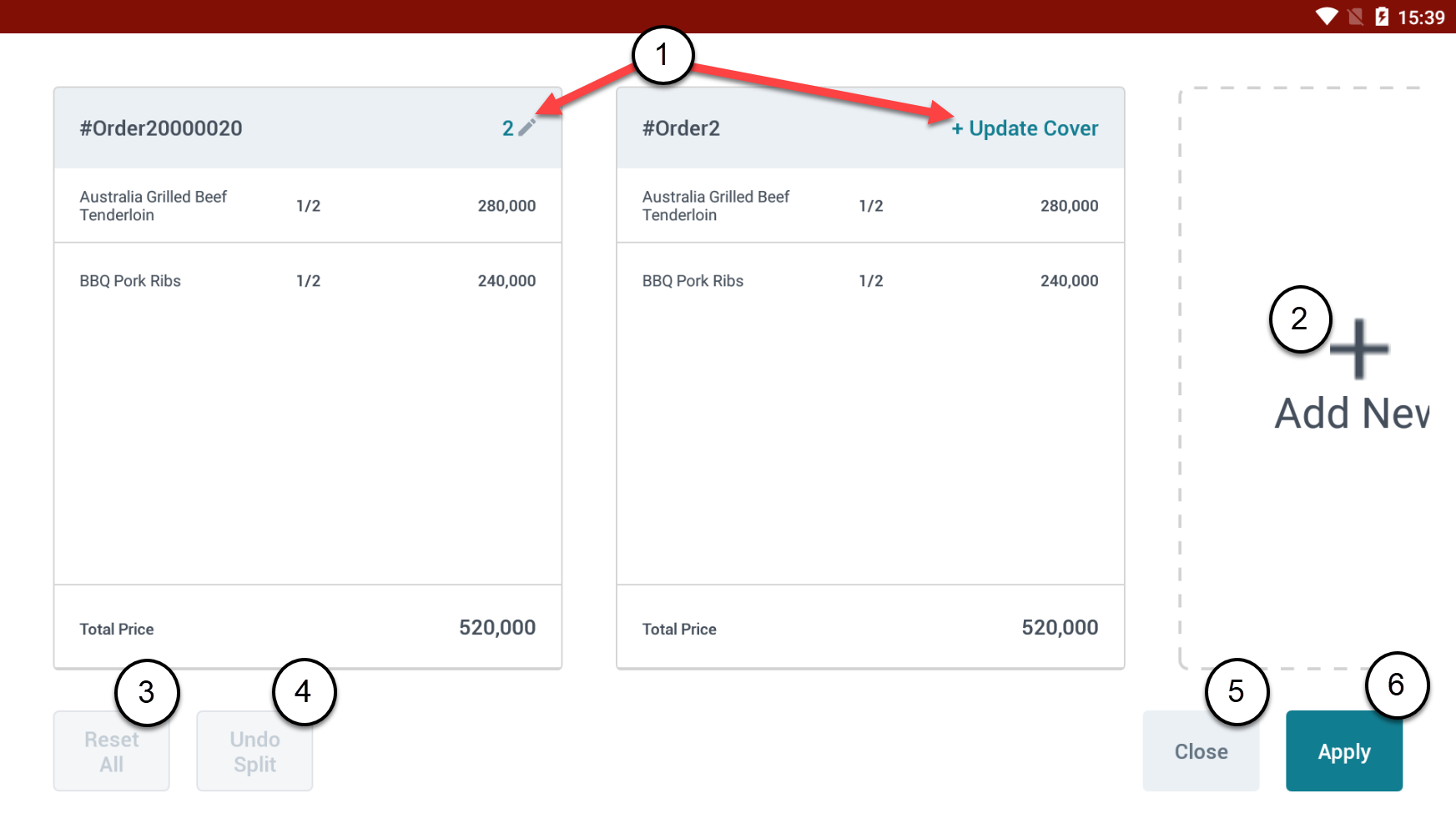 1/ Split Evenly : Tách đều đơn hàng ![]() Các nút chức năng thao tác split đơn hàng (1) Update Cover: Cập nhật số khách cho từng đơn được tách (2) Add New: Tách đều đơn gốc ra thêm 1 đơn nữa (3) Reset All: Xóa hết tất cả các thao tác trong màn hình tách đơn hàng này (4) Undo Split: Quay lại thao tác trước đó (5) Close: Xác nhận không thực hiện tách đơn hàng (6) Apply: Xác nhận thực hiện tách đơn hàng Chọn (Add New) mở một đơn hàng mới ![]()