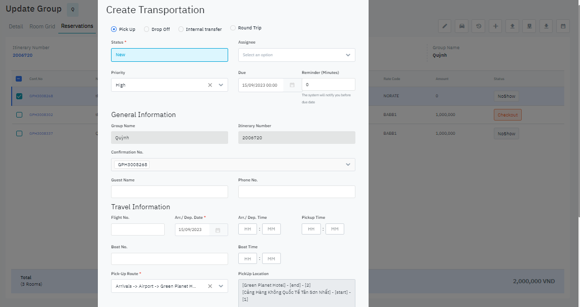 Việc tạo task xe đưa đón cho khách đoàn chỉ có thể thực hiện được với điều kiện đoàn đã thực hiện tạo booking trên hệ thống.Đổi với các booking cần tạo task xe đưa đón cho các khách với thời gian khác nhau trong cùng một phòng, người dùng cho thể chọn lại các phòng đó & cập nhật riêng tên khách cho từng thời gian khác nhau tương ứng.Khi tạo task xe đưa đón cho các khách trong đoàn từ một đoàn, các thông tin về Group Name, Itinerary Number, Confirmation Number sẽ được tự động điền tương ứng với các booking người dùng đã chọn trong danh sách đặt phòng của khách đoàn & không thể chỉnh sửa. Người dùng muốn thay đổi các thông tin đó cần chọn lại từ màn hình danh sách các đặt phòng trong đoàn. |