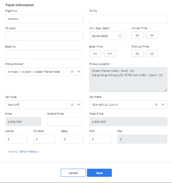 Cập nhật thông tin cho nhiệm vụ đón/tiễn Tích chọn nhiệm vụ. Hệ thống hiển thị thông tin chi tiết của nhiệm vụ và người dùng có thể chỉnh sửa và cập nhật các thông tin cho nhiệm vụ được chọn ![]() ![]()