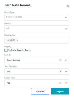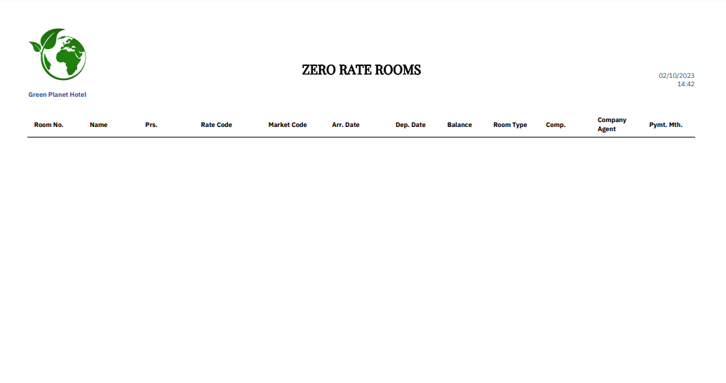 Log in – Front Office – Reports – Zero Rate Rooms |
