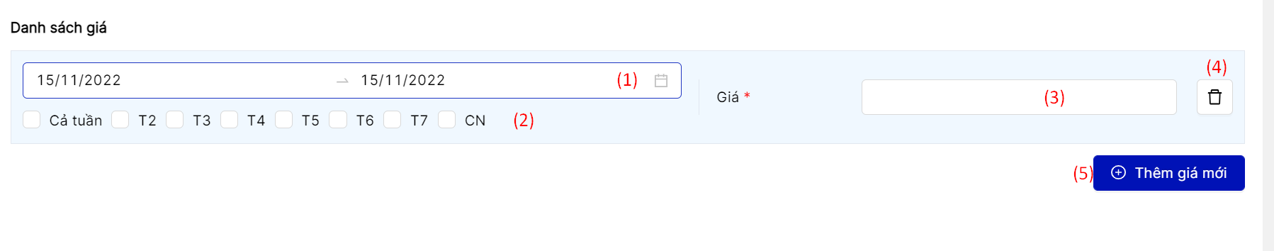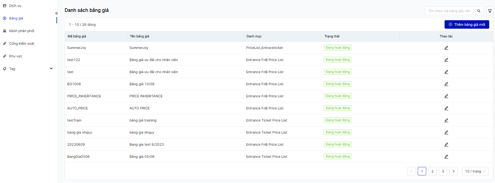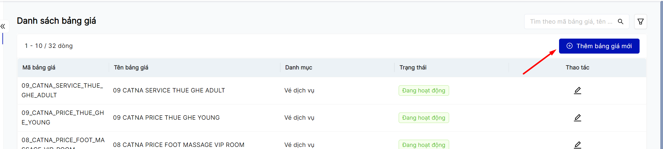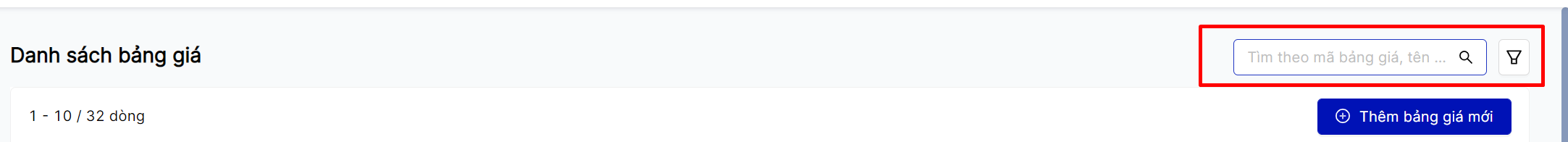 [Tìm kiếm và lọc bảng giá] ![]() Người dùng nhập thông tin mã giá và tên bảng giá để thực hiện tìm kiếm [Thao tác tạo và chỉnh sửa bảng giá]