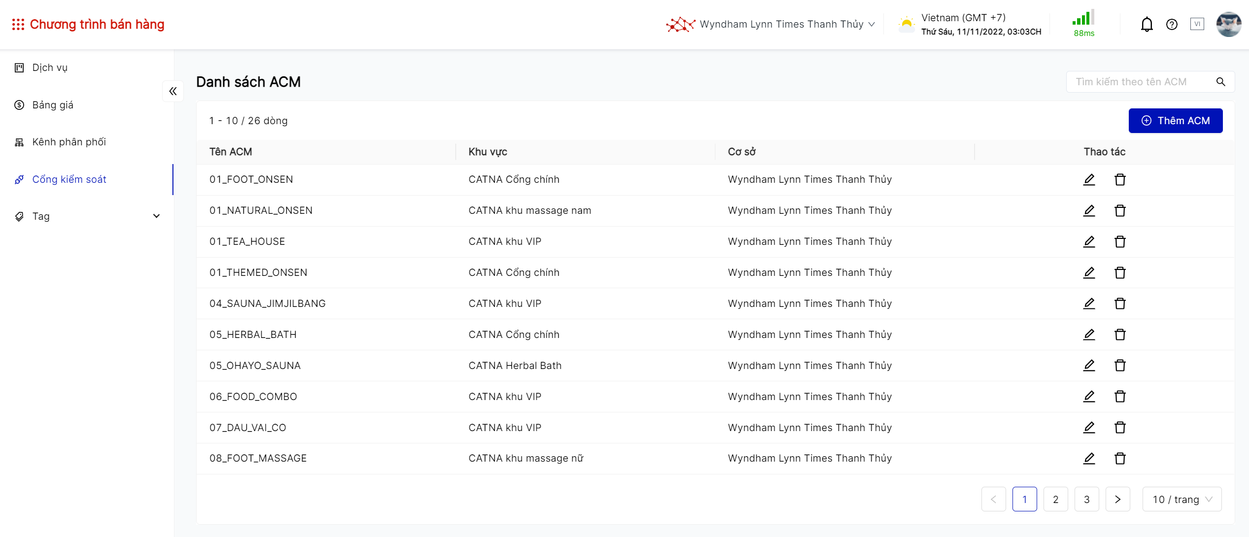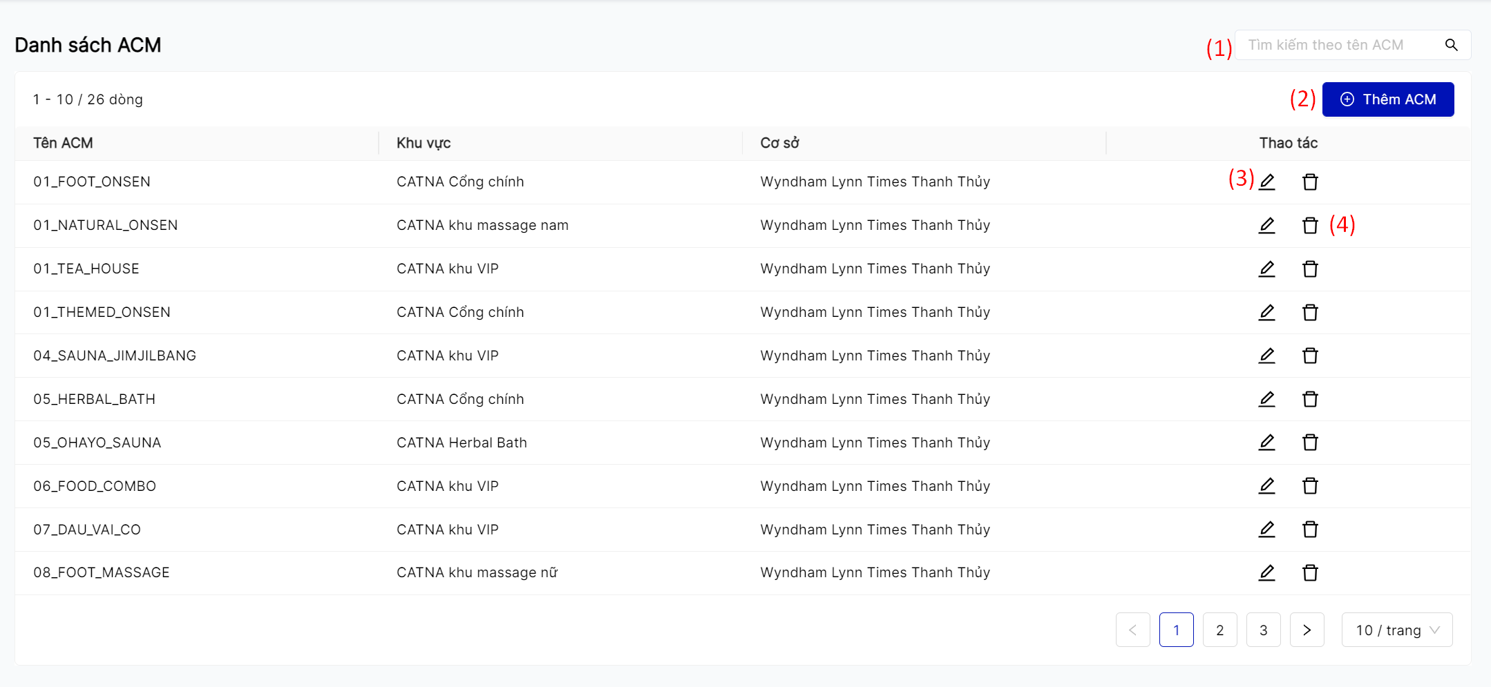 ![]() (1) Tìm kiếm theo tên ACM: Nhập tên ACM để thực hiện tìm kiếm (2) Thêm ACM: Chọn để thực hiện cấu hình thông tin ACM khi cơ sở có nhu cầu tạo thêm các cổng ACM ![]()