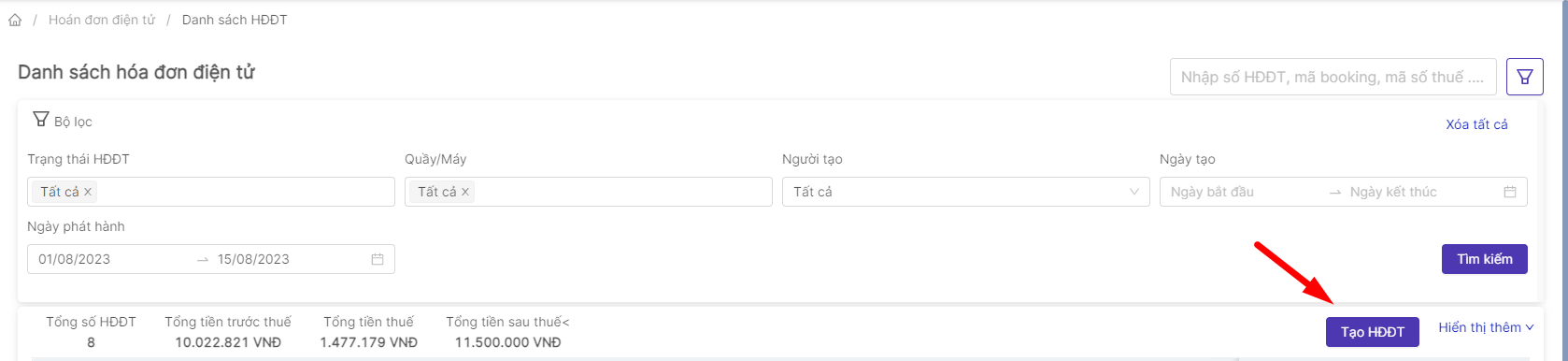 [Tạo HĐĐT]Tích chọn những HĐ chưa tạo và chọn “Tạo HĐĐT” để xuất HĐ: ![]() [Xem danh sách HĐĐT]Xem lại danh sách những HĐ đã xuất và cho phép thao tác chỉnh sửa, tải về hoặc hủy Hóa đơn. ![]()