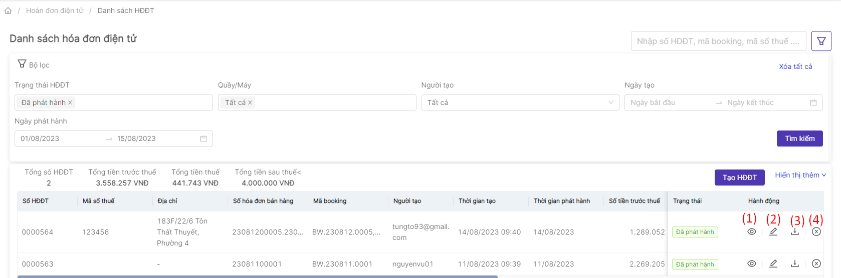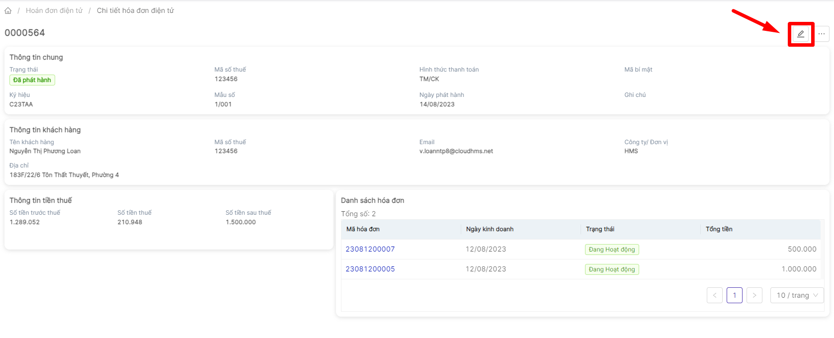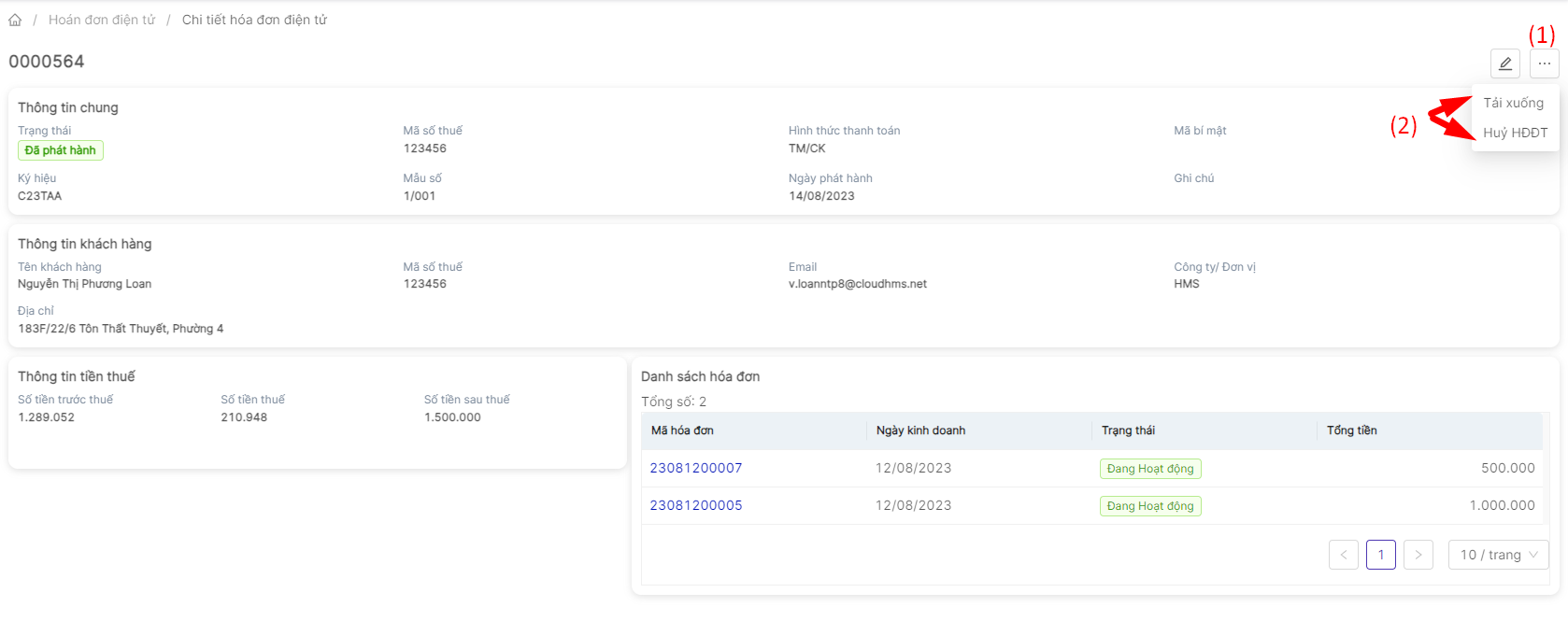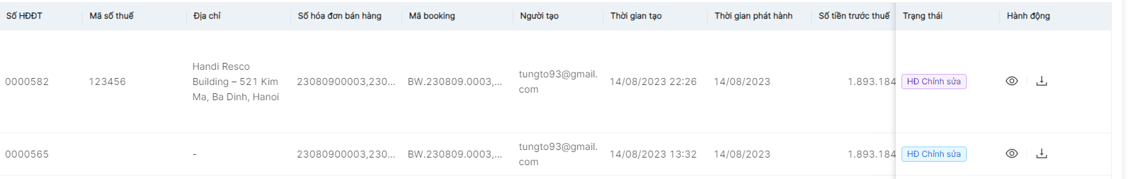 Người dùng có thể chọn vào biểu tượng “cây bút” để chỉnh sửa thông tin hóa đơn ![]() Ngoài ra, người dùng có thể thao tác “tải xuống hóa đơn” hoặc “hủy hóa đơn” bằng cách click vào biểu tượng 3 chấm ![]()