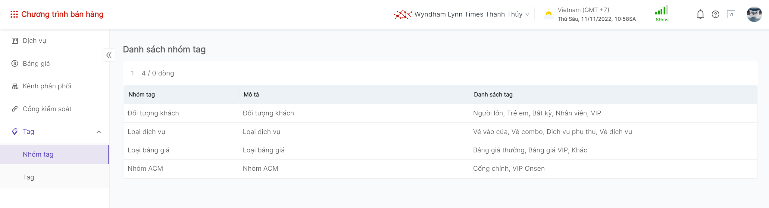 Log in – Chương trình bán hàng – Tag – Nhóm tag |