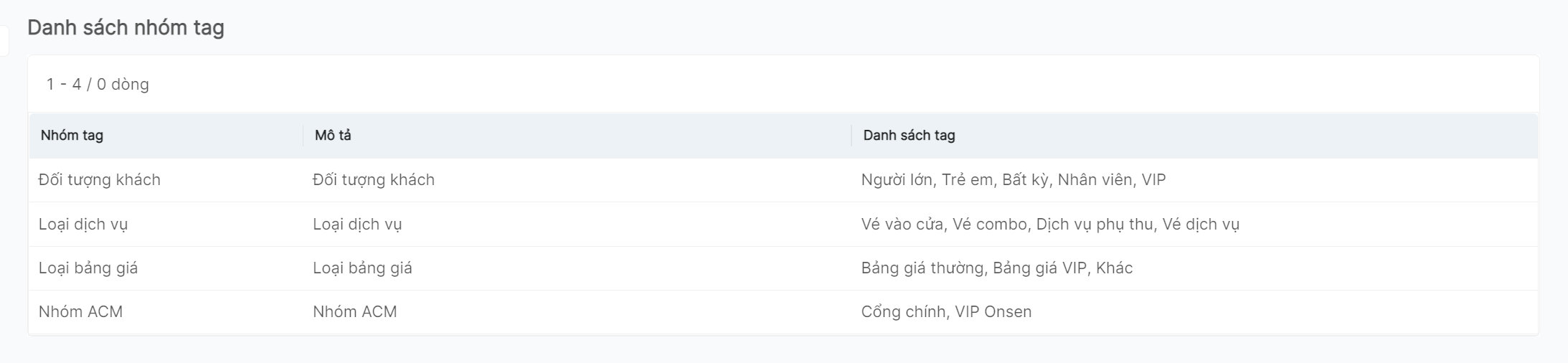 Nhóm tag để phân loại khi cần gom nhóm các mã giá, mã gói dịch vụ, kênh phân phối có chung đặc điểm |