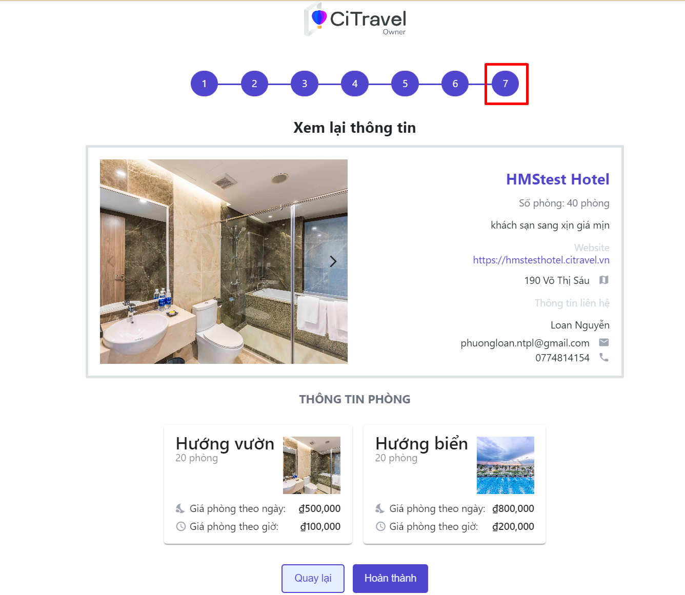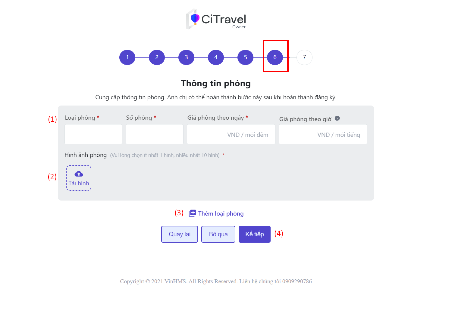 ![]() 6. Bước 6: Nhập thông tin phòng ![]() (1) Nhập thông tin Loại phòng, số lượng phòng của loại phòng đó, giá bán theo ngày và theo giờ của loại phòng đó. Bắt buộc nhập Về giá bán theo giờ, nếu cơ sở không bán phòng theo giờ thì không cần nhập giá. (2) Tải lên ít nhất 1 hình ảnh liên quan đến loại phòng đó, bắt buộc tải hình ảnh lên (3) Trong trường hợp cơ sở có nhiều loại phòng, chọn Thêm loại phòng để thêm thông tin loại phòng, số lượng phòng và giá bán tương tự (1) (4) Chọn Bỏ qua nếu người dùng muốn bỏ qua bước này, sẽ cập nhật thông tin phòng sau khi hoàn tất đăng ký 7. Bước 7: Xem lại thông tin Người dùng xem xác nhận lại thông tin, sau đó chọn Hoàn thành để hoàn tất quá trình đăng ký ![]() ![]() 8. Kiểm tra mail để lấy thông tin đăng nhập vào hệ thống