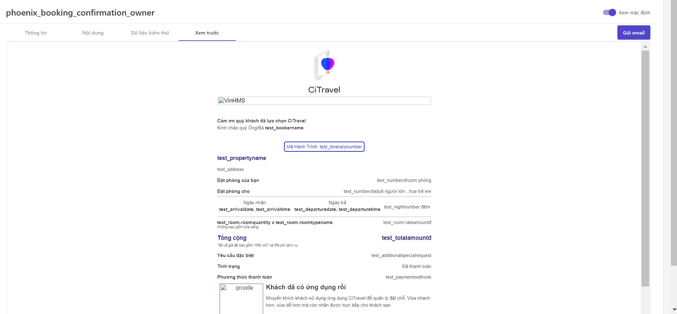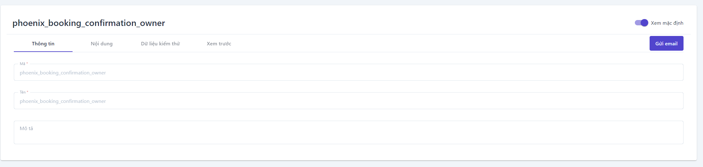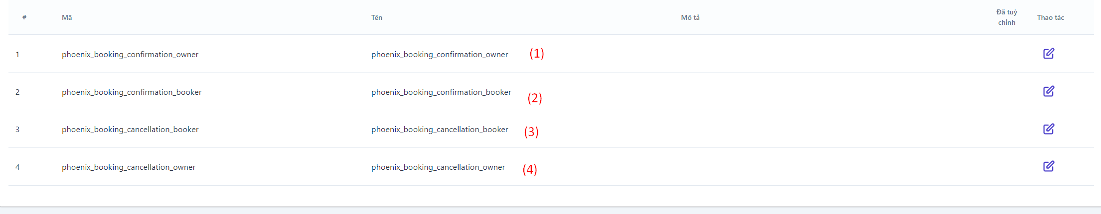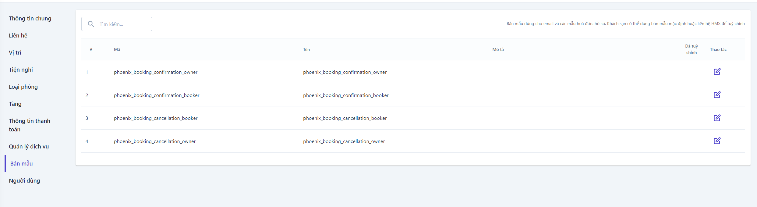![]() Có 4 loại biểu mẫu được cấu hình sẵn cho cơ sở, người dùng có thể vào chỉnh sửa các trường thông tin tùy ý, trong trường hợp người dùng cần sử dụng các biểu mẫu khác thì có thể liên hệ admin để được hỗ trợ (1) Phiếu xác nhận đặt phòng dành cho chủ cơ sở lưu trú (2) Phiếu xác nhận đặt phòng dành cho khách đặt phòng (3) Phiếu xác nhận hủy đặt phòng dành cho chủ cơ sở lưu trú (4) Phiếu xác nhận hủy đặt phòng dành cho khách đặt phòng Để thao tác chỉnh sửa thông tin của 4 loại mẫu phiếu trên, người dùng chọn biểu tượng :chỉnh: để thực hiện ![]()