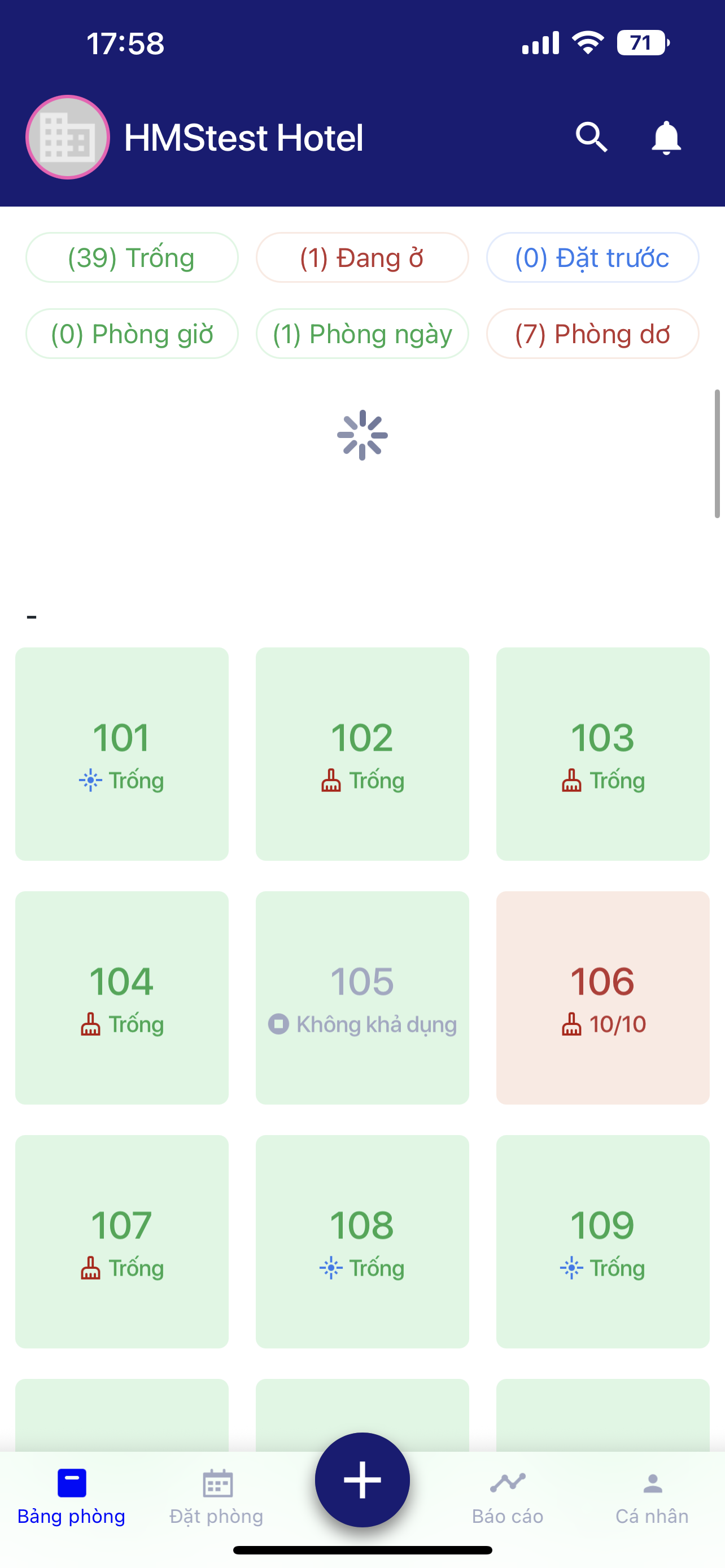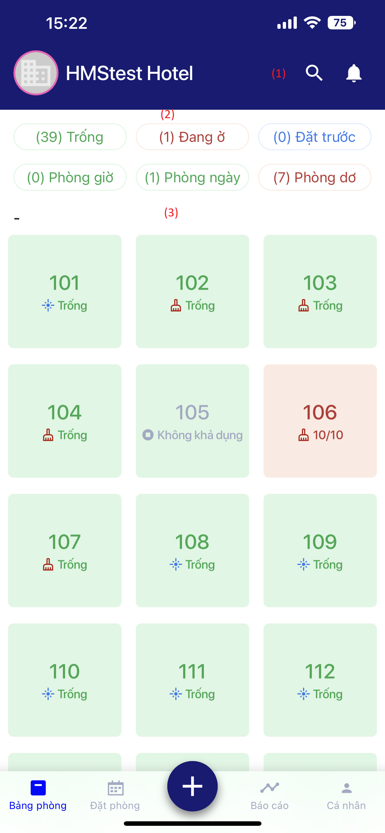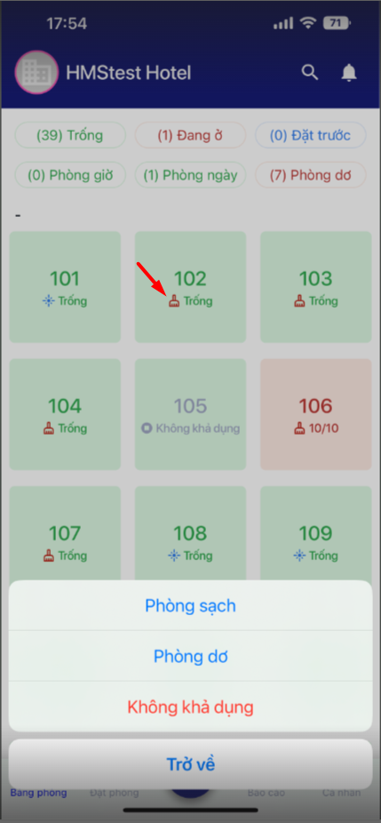 (3) Sơ đồ phòng và trạng thái phòng: Click vào icon để chuyển trạng thái phòng: phòng sạch, phòng dơ, không khả dụng ![]()