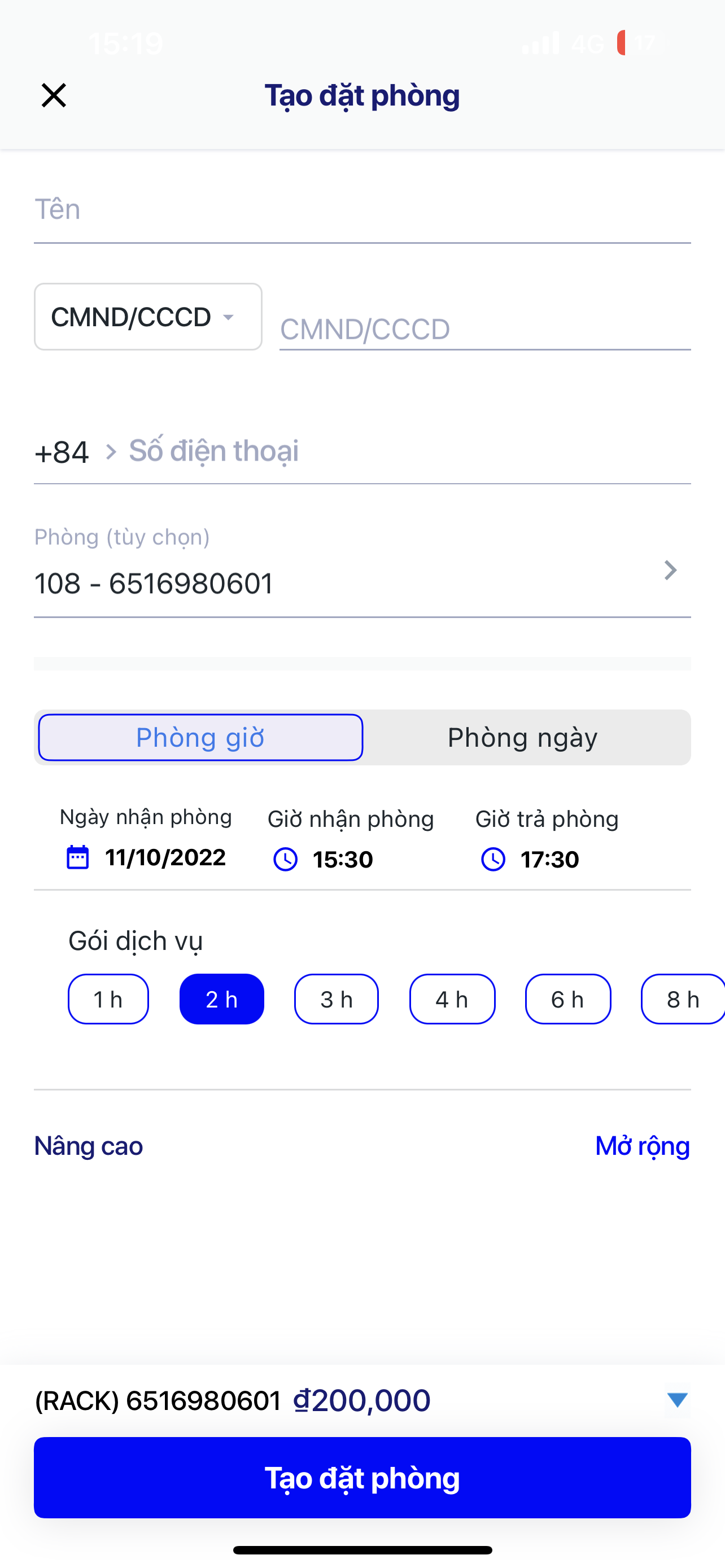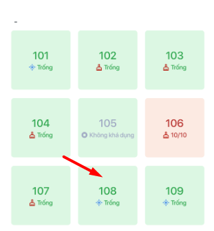 Lưu ý: Người dùng có thể vuốt màn hình xuống để làm mới màn hình sơ đồ phòng ![]() Ngoài ra tại màn hình “Bảng Phòng” người dùng có thể tạo mới 1 đặt phòng bằng cách click vào phòng trống bất kì để tạo mới 1 đặt phòng tương ứng với thông tin của phòng được chọn ![]() Hiển thị ra bảng thông tin tạo Đặt Phòng: ![]() |