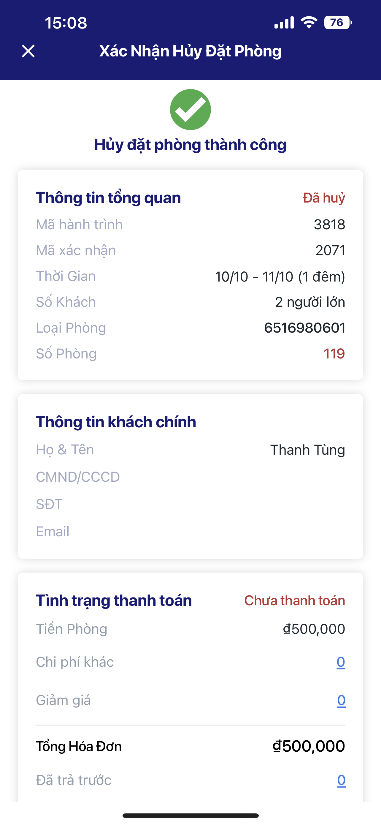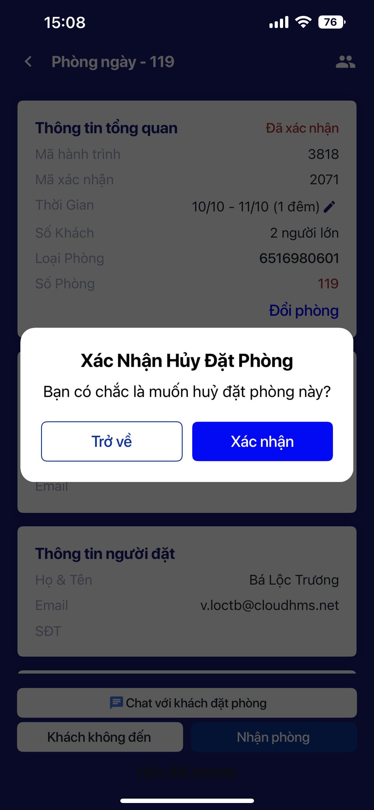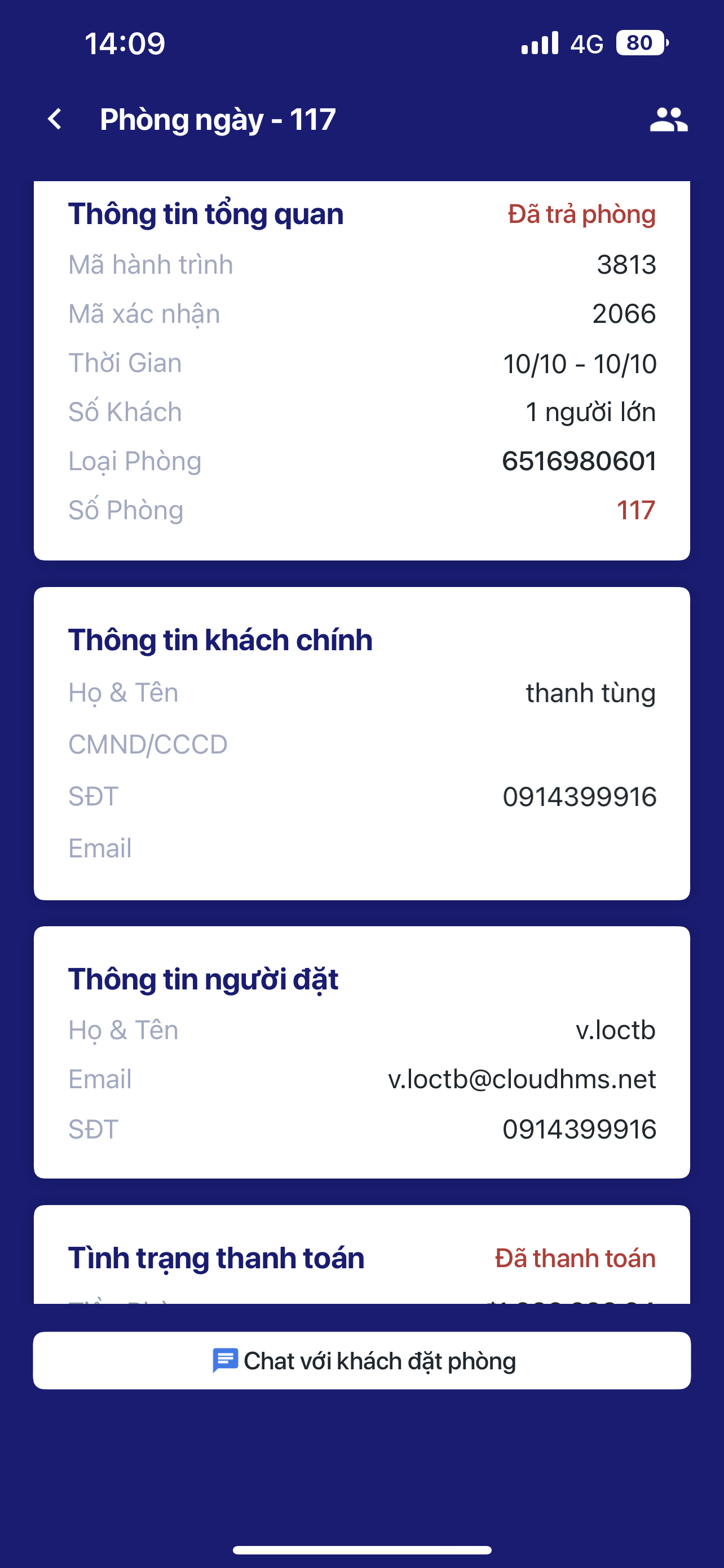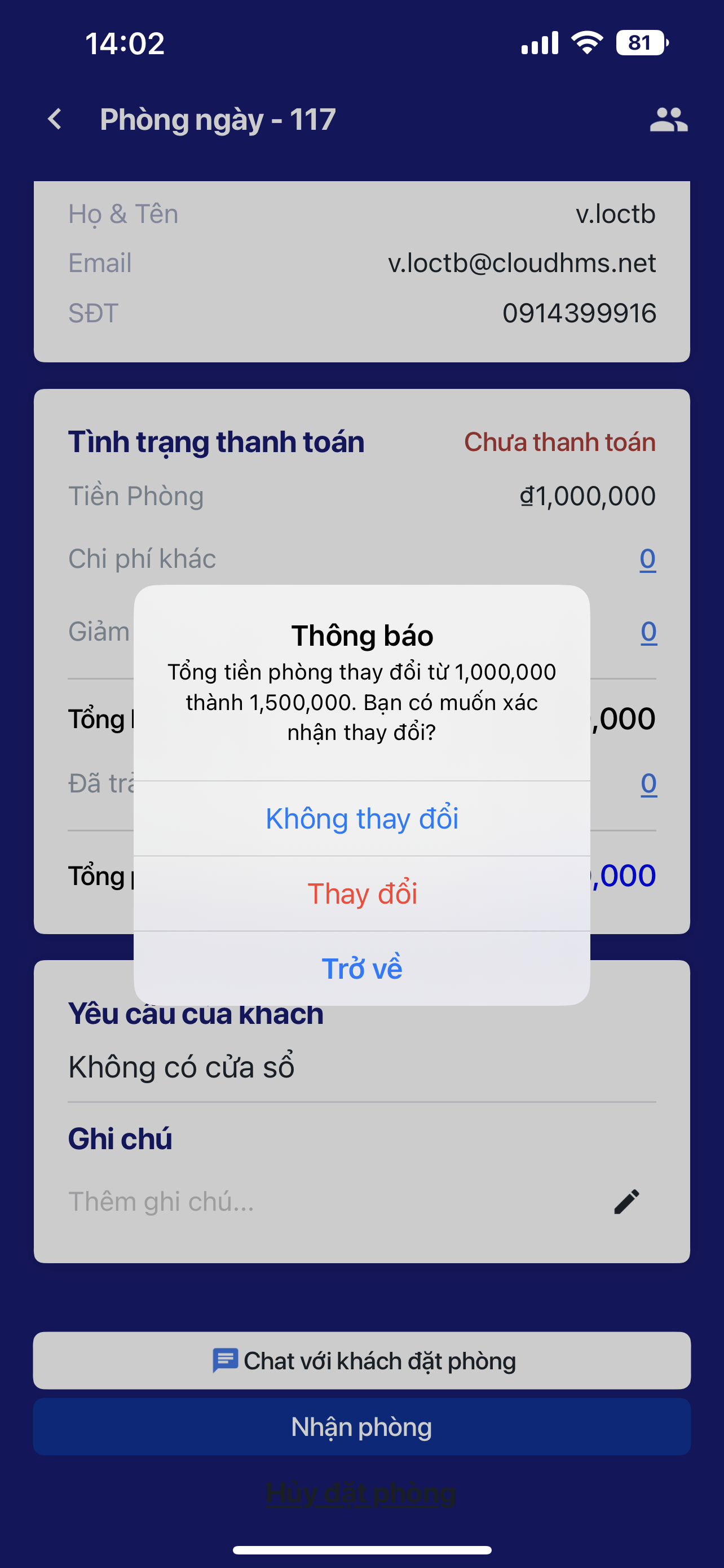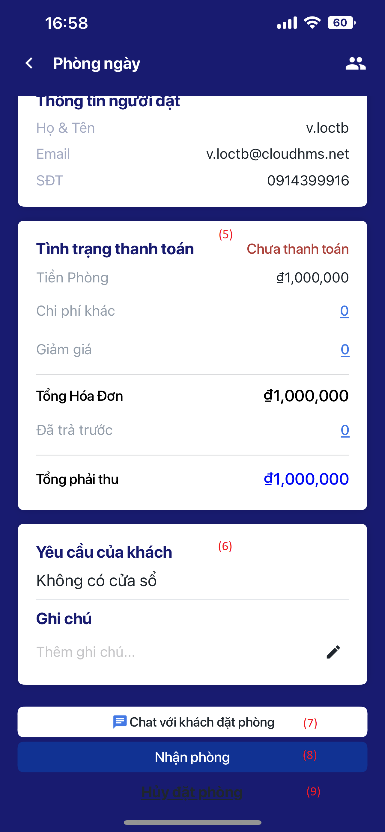 (2) Cơ sở lưu trú của chủ khách sạn: chọn được tên khách mà chủ khách sạn sở hữu ![]() (3) Thông báo: Tại đây người dùng có thể kiểm tra được tất cả các thông tin”Đặt phòng” từ mới nhất ![]() Khi chọn vào bất kì “Yêu cầu đặt phòng mới” sẽ hiển thị ra thông tin chi tiết của 1 “Đặt phòng” ![]() ![]() (1) Thông tin khách: tại đây chủ khách sạn có thể chỉnh sửa thông tin của khách đặt phòng ![]() Họ và tên Giới tính Ngày sinh Nơiu sinh Địa chỉ thường trú SĐT Nghề nghiệp CMND/CCCD Loại khách Quốc tịch Ghi chú Ảnh Chụp giấy tờ: chụp hình ảnh liên quan đến giấy tờ (2) Thông tin tổng quan: Mã hành trình Mã xác nhận Thời gian: tại đây có thể thay đổi thông tin đêm ở cho khách ![]() Số khách Loại Phòng Số Phòng Chọn “Gán” để phân phần cho khách lưu trú ![]() Chọn “Đổi phòng” để bỏ gán hoặc đổi phòng cho khách lưu trú ![]() (3) Thông tin khách chính: Họ & Tên CMND/CCCD SĐT (4) Thông tin người đặt: Họ & Tên SĐT (5) Tình trạng thanh toán: Tiền phòng Chi phí khác Giảm giá Tổng hóa đơn Đã trả trước Tổng phải thu (6) Yêu cầu của khách, Ghi chú (7) Chat với khách đặt phòng: ![]() (8) Nhận phòng: ![]()