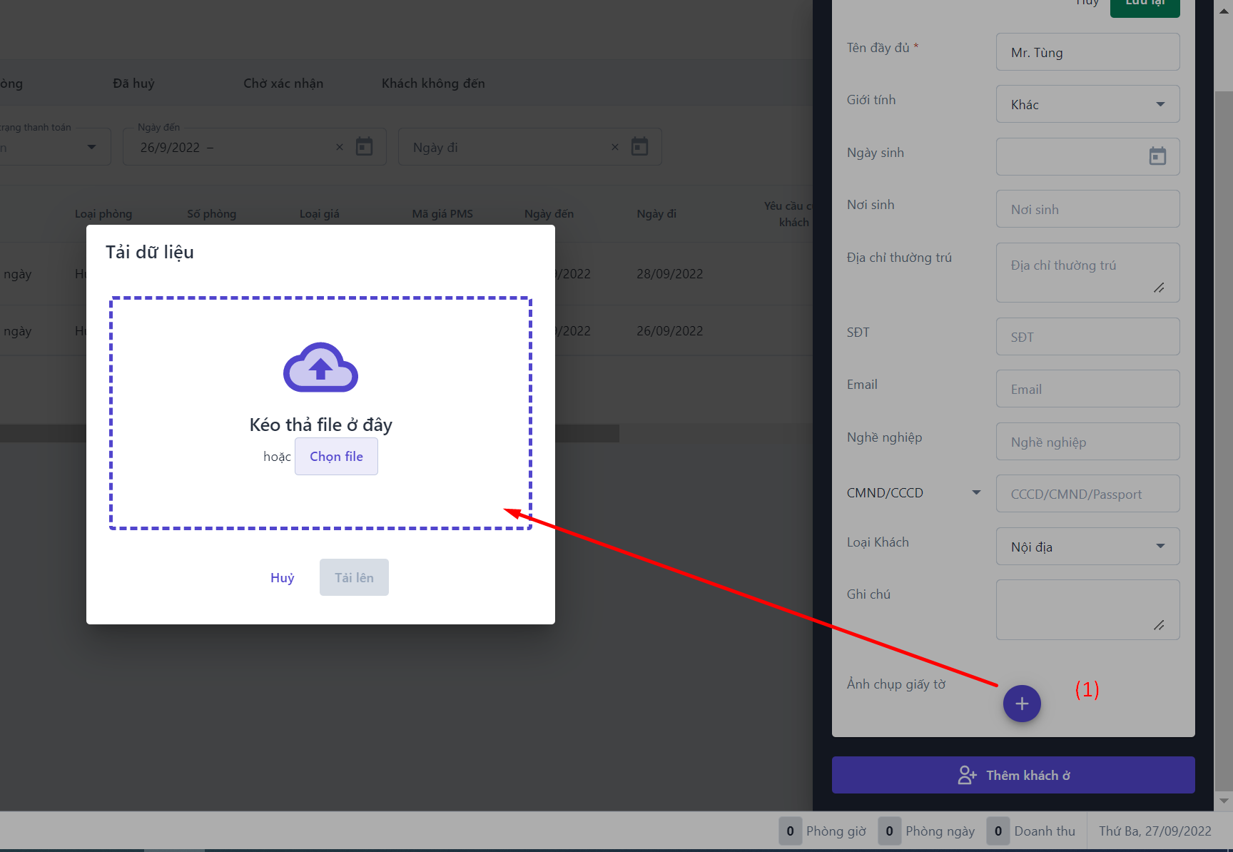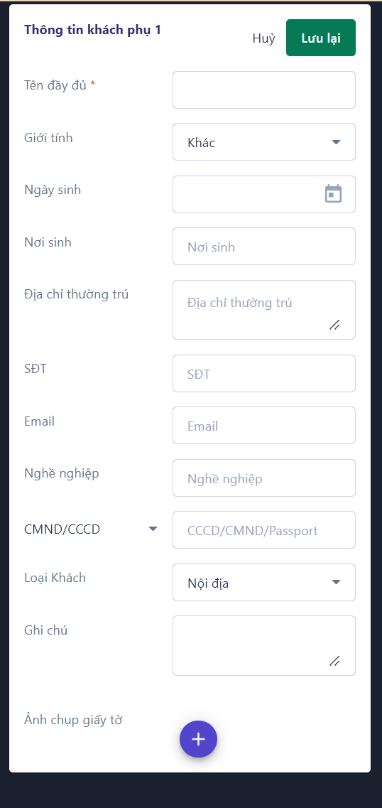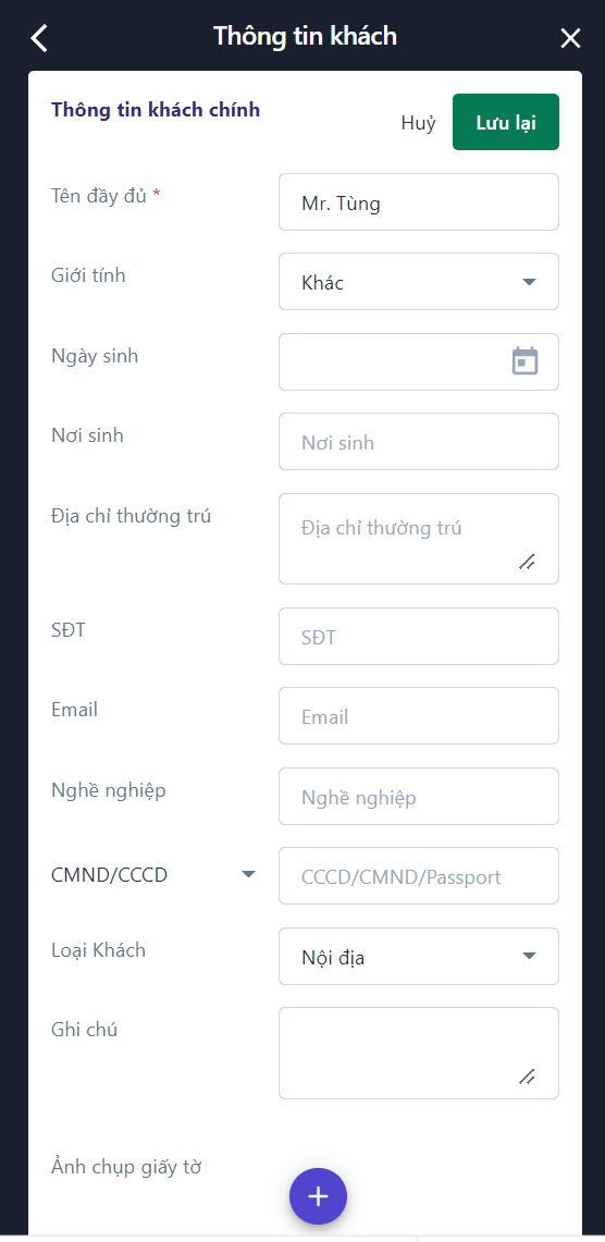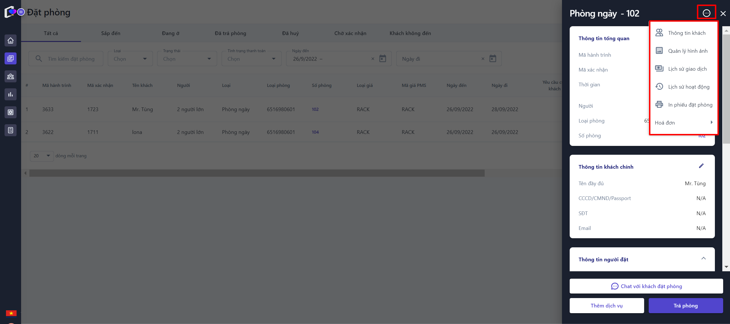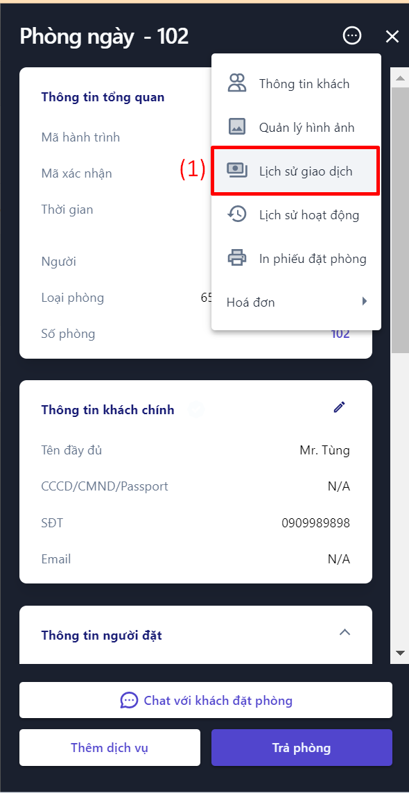 Để thực hiện các chức năng bên dưới, người dùng cần vào chi tiết 1 đặt phòng có trên hệ thống 1.Thông tin khách