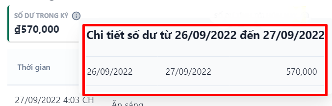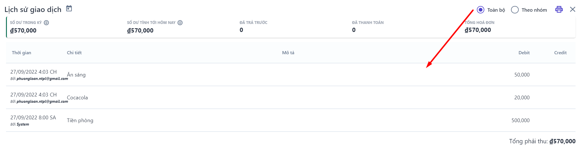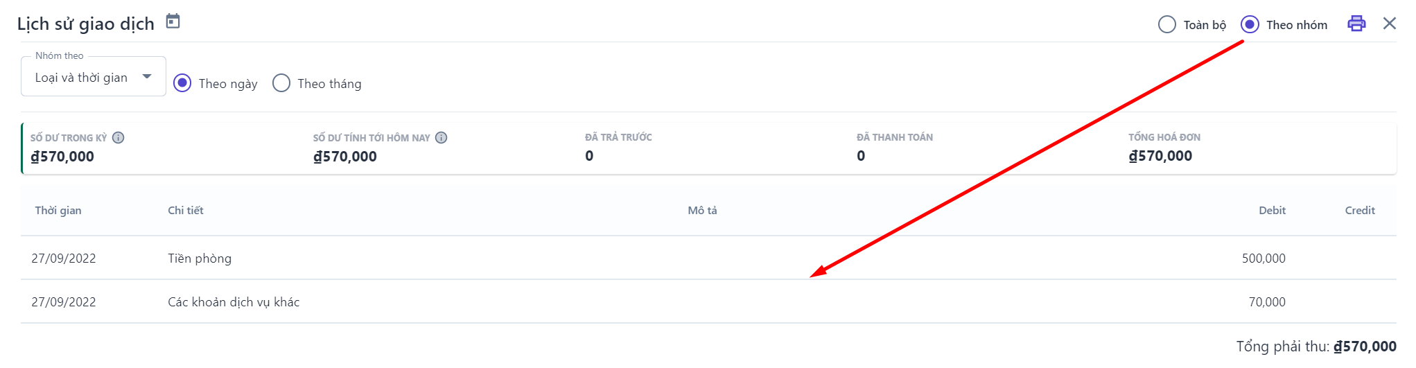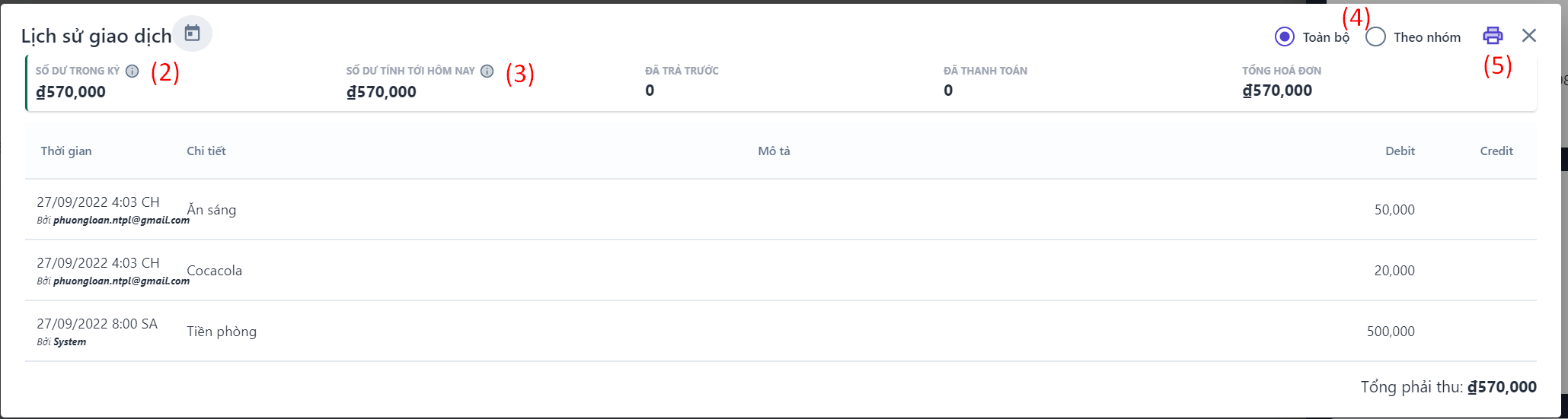 ![]() 3. Lịch sử giao dịch ![]() (1) Chọn lịch sử giao dịch để xem toàn bộ các giao dịch của đặt phòng trong thời gian lưu trú ![]() (2) Xem số dư trong kỳ: Chọn vào biểu tượng:chi_tiết: để xem chi tiết số dư của đặt phòng trong toàn thời gian lưu trú ![]() (3) Xem số dư tính tới hôm nay: Chọn vào biểu tượng:chi_tiết: để xem chi tiết số dư của đặt phòng tính tới hôm nay ![]() (4) Xem lịch sự giao dịch theo 2 cách
