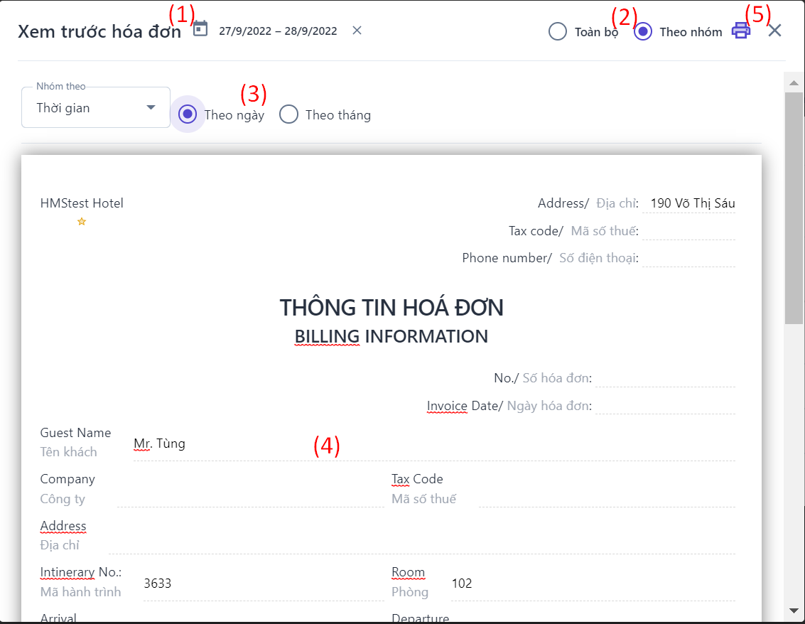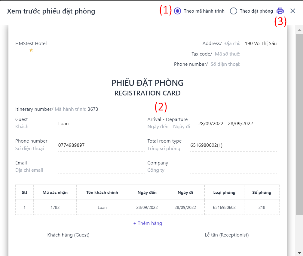4. Lịch sử hoạt động 5. In phiếu đặt phòng ![]() (1) Người dùng có thể chọn in phiếu đặt phòng theo mã hành trình hoặc theo đặt phòng (2) Người dùng có thể chỉnh sửa hoặc thêm bớt các trường thông tin nếu cần (3) Chọn biểu tượng :in: để in phiếu đặt phòng 6. Xuất hóa đơn: Tương tự các thông tin ở mục (5) in hóa đơn của phần Lịch sử giao dịch ![]()