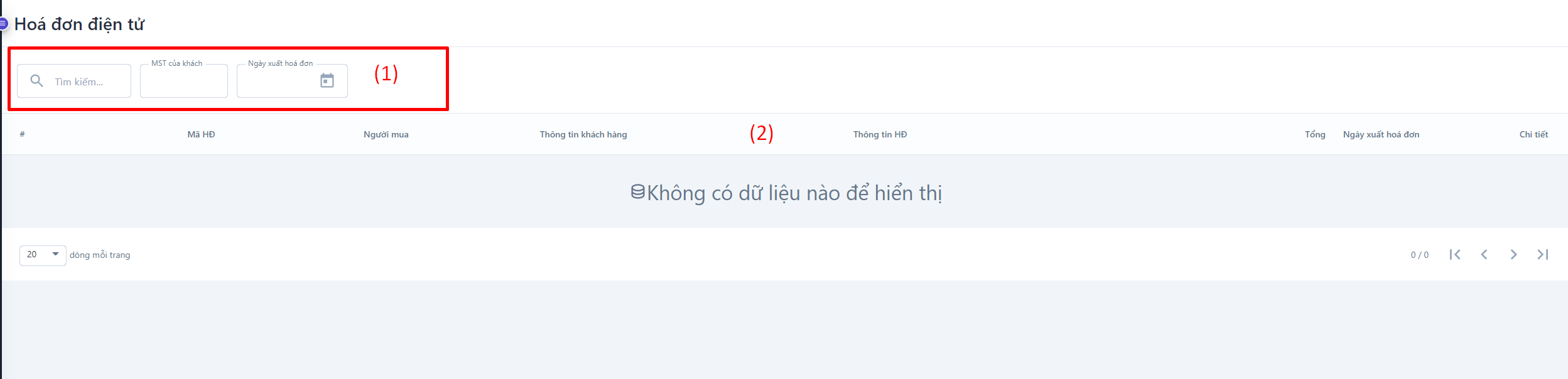 ![]() (1) Điều kiện lọc và tìm kiếm thông tin hóa đơn điện tử