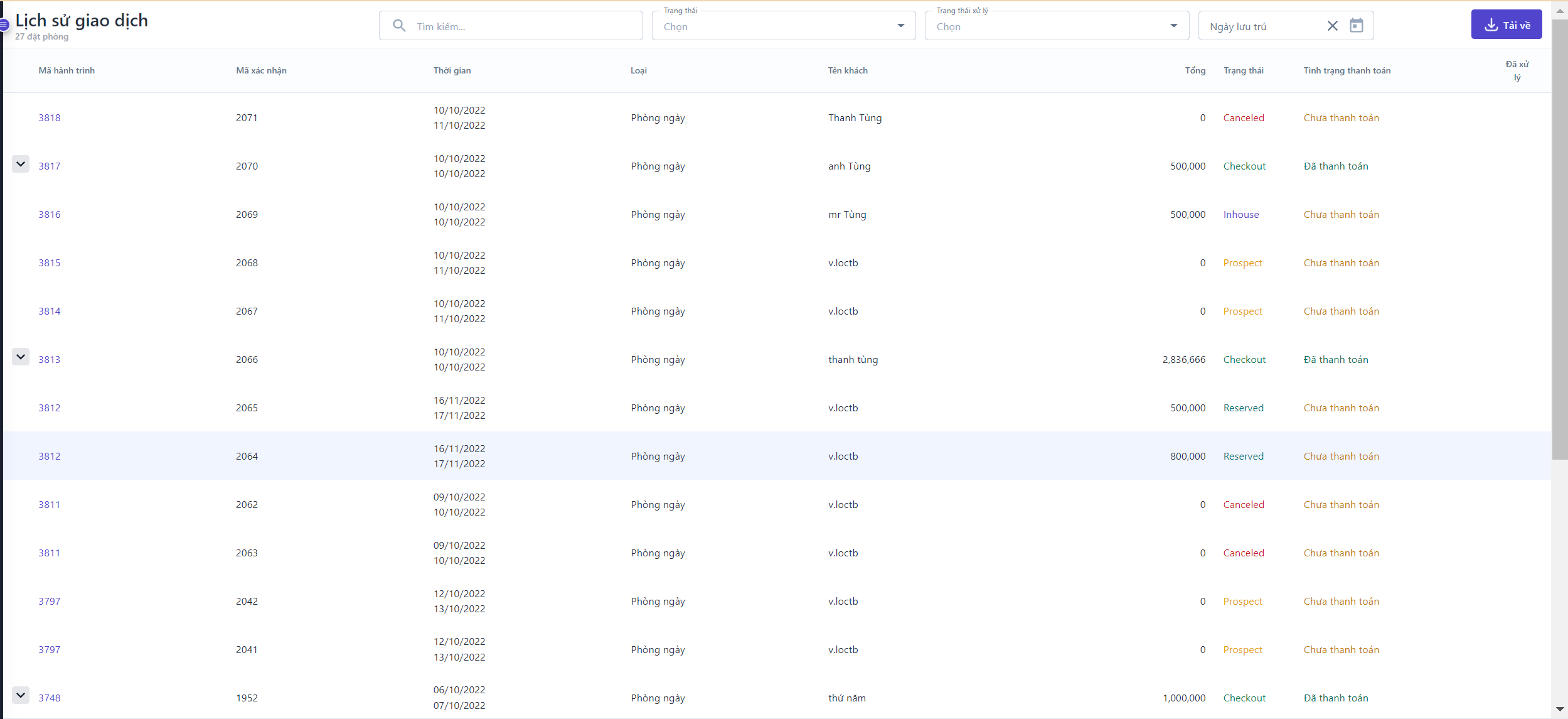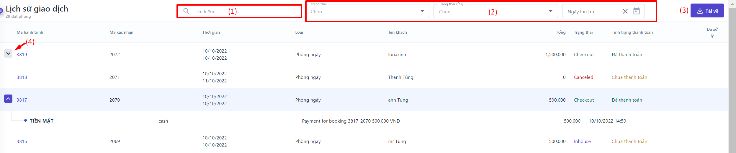 ![]() (1) Tìm kiếm: Người dùng có thể tìm kiếm lịch sử giao dịch bằng Mã hành trình, Mã xác nhận, Tên khách.. (2) Điều kiện lọc: Người dùng có thể lọc theo trạng thái lưu trú, trạng thái xử lý và khoảng thời gian lưu trú để tìm kiếm lịch sử giao dịch (3) Tải về: Người dùng chọn “Tải về” để thực hiện tải danh sách lịch sử giao dịch theo định dang Excel (4) Xem chi tiết lịch sử thanh toán: Ở các giao dịch có trạng thái Đã thanh toán, người dùng có thể chọn biểu tượng :thả: để xem chi tiết thời gian thanh toán |