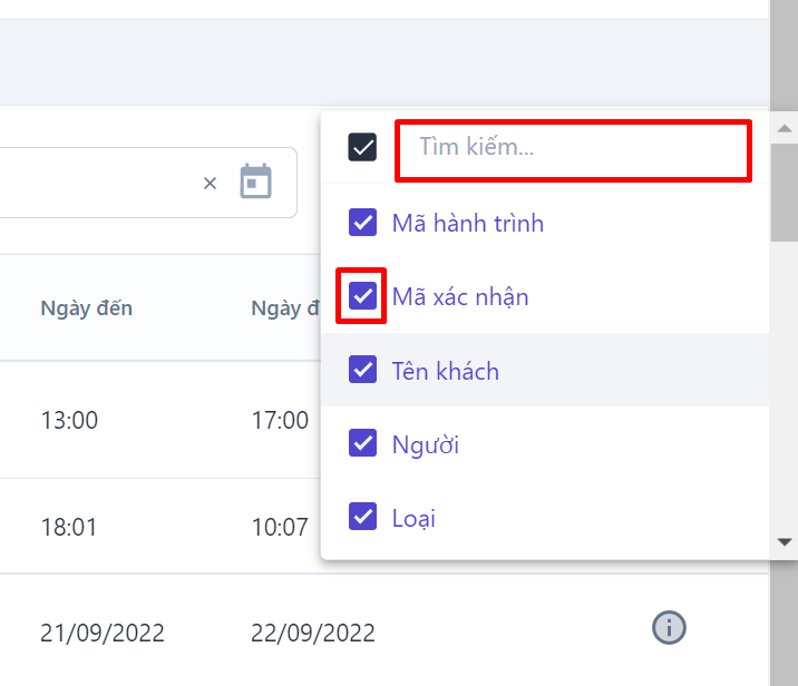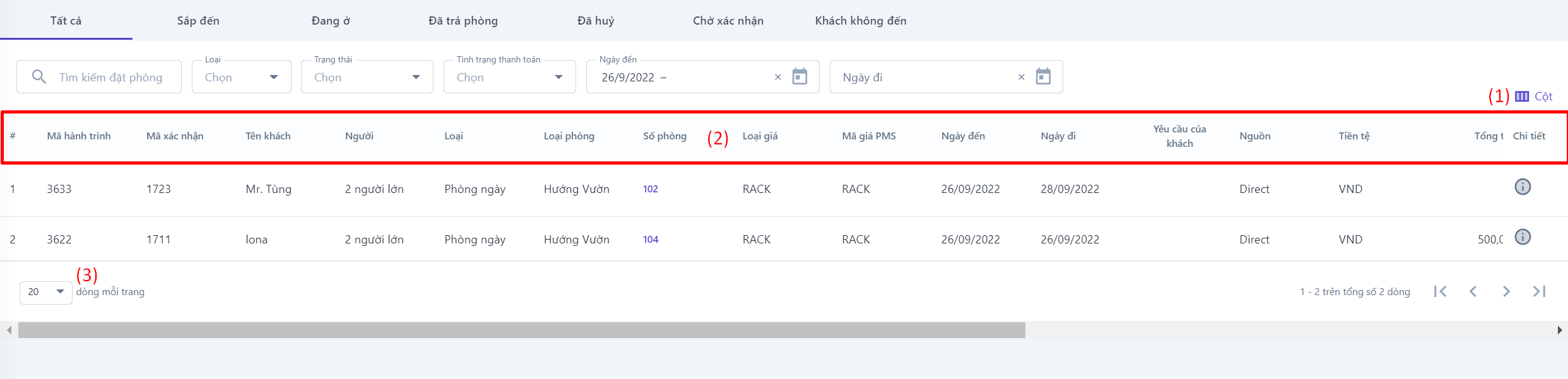 Màn hình toàn bộ đặt phòng![]() (1) Thêm/ bớt các trường thông tin hiển thị ở màn hình đặt phòng ![]()