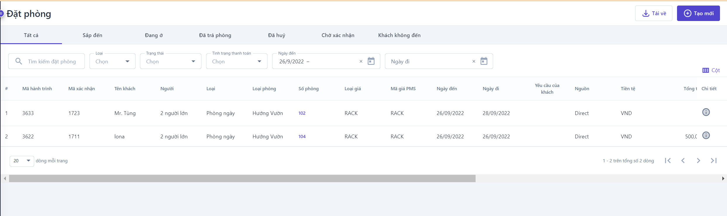 Màn hình hiển thị toàn bộ danh sách đặt phòng đã phát sinh trong hệ thống và chia chi tiết theo các thông tin tình trạng: