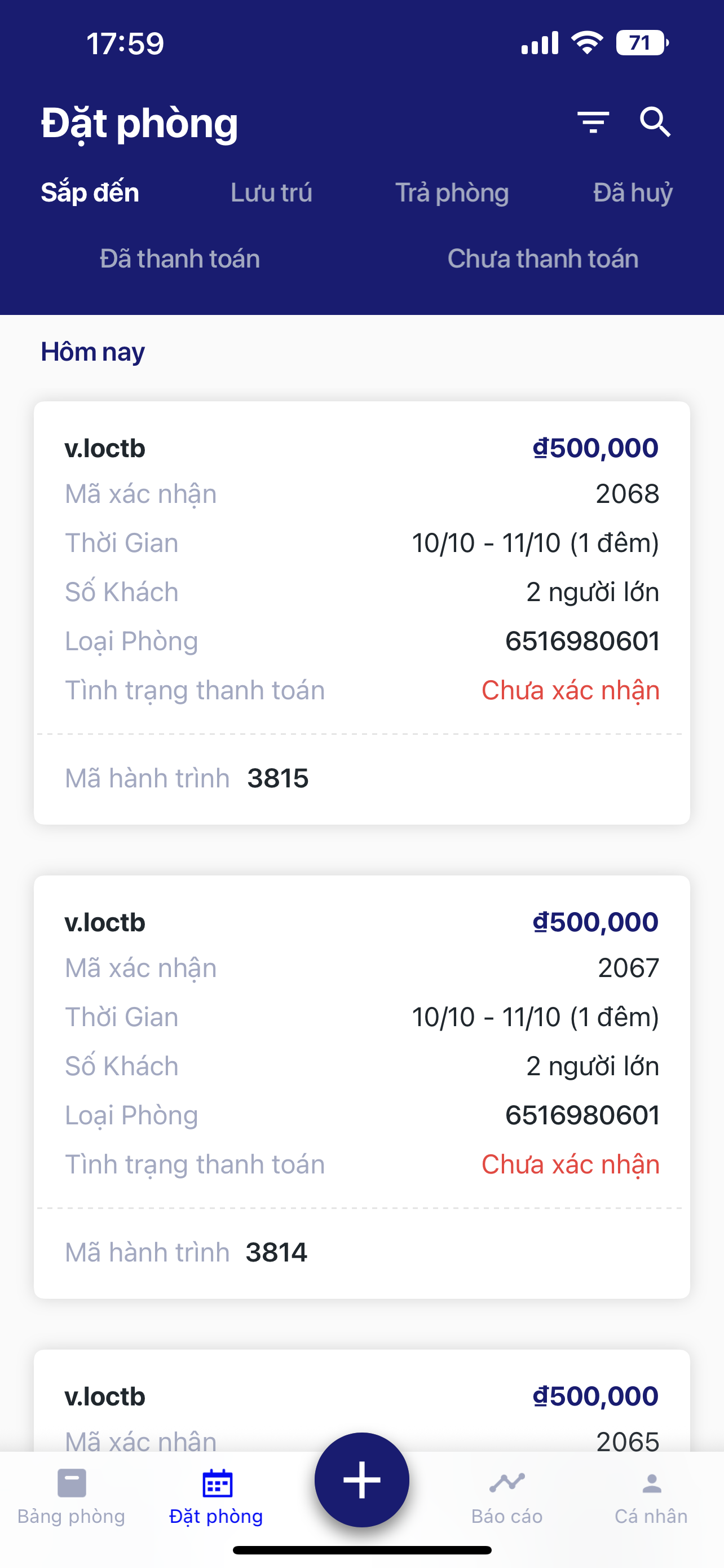 Màn hình hiển thị toàn bộ danh sách đặt phòng đã phát sinh trong hệ thống và chia chi tiết theo các thông tin tình trạng:
