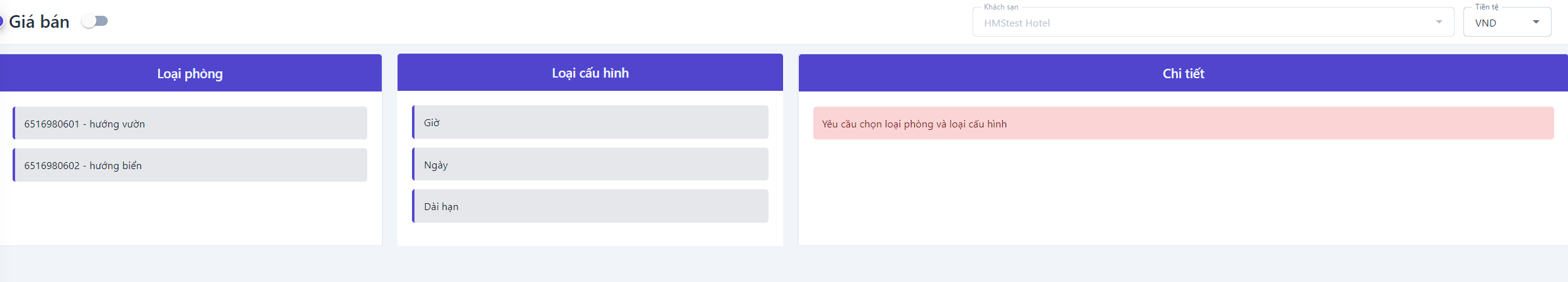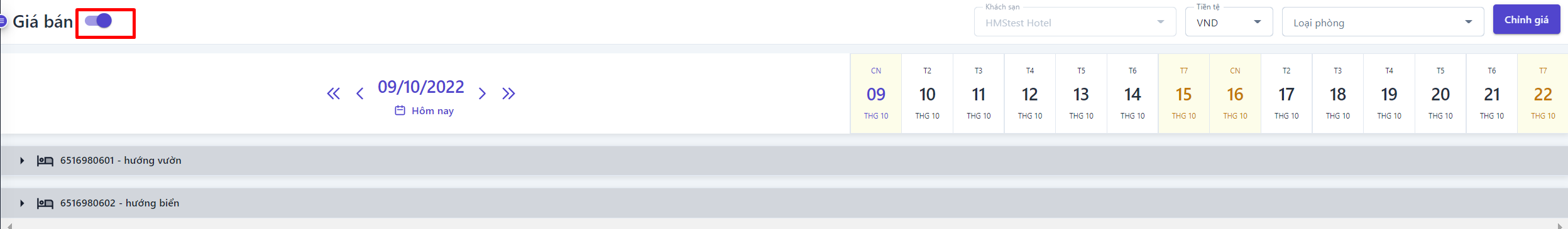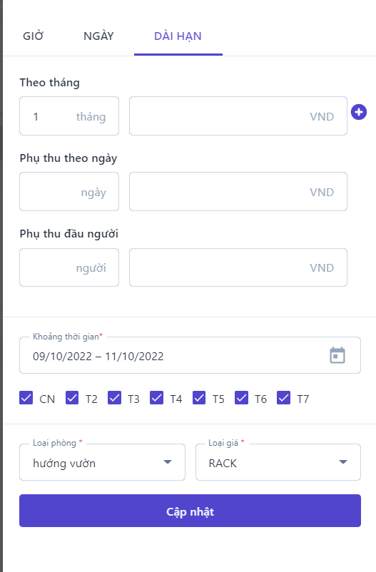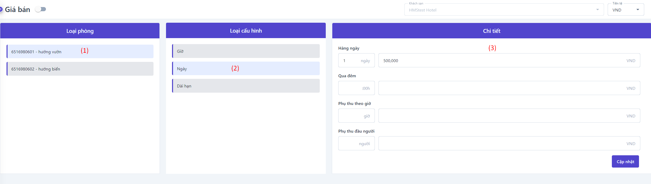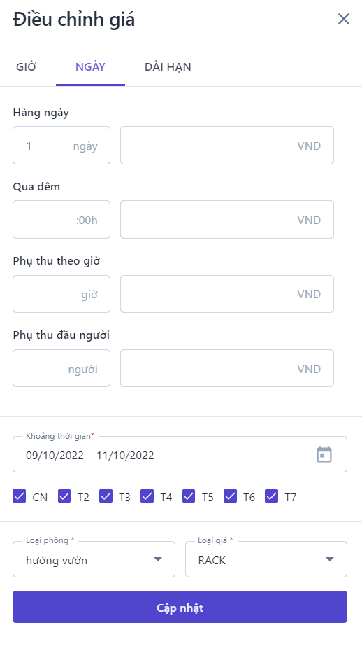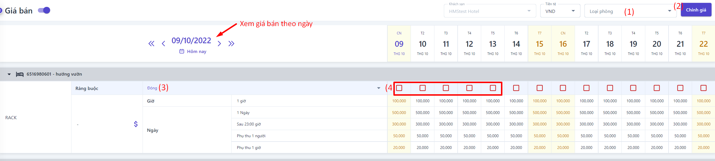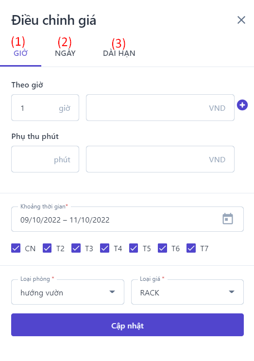 Giá bán nâng cao: Bật thanh trạng thái để hiển thị cài đặt giá bán nâng cao![]() ![]() (1) Chọn loại phòng cần xem và điều chỉnh giá bán (2) Điều chỉnh: Chọn để thực hiện điều chỉnh giá bán theo Giờ, theo Ngày hoặc Dài hạn ![]()