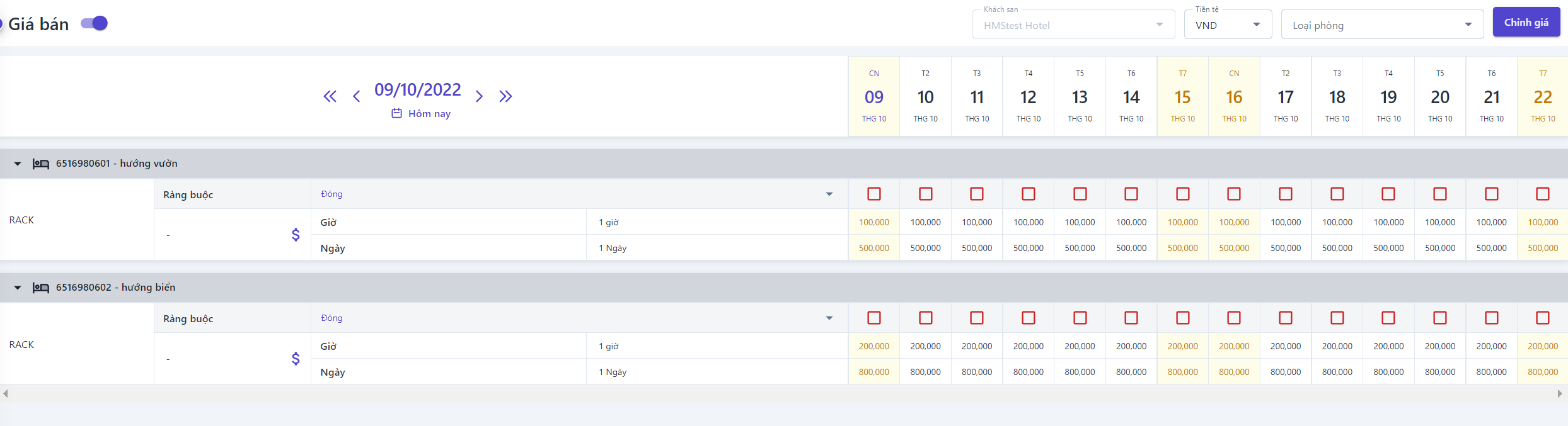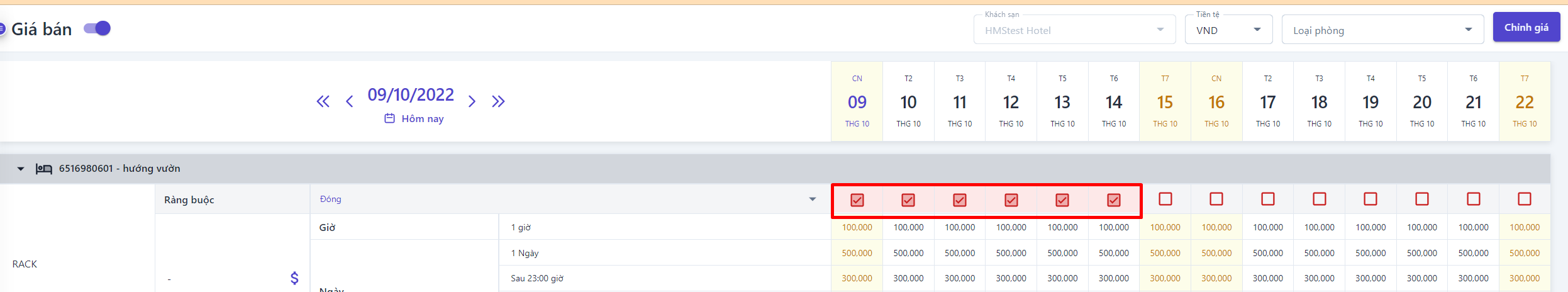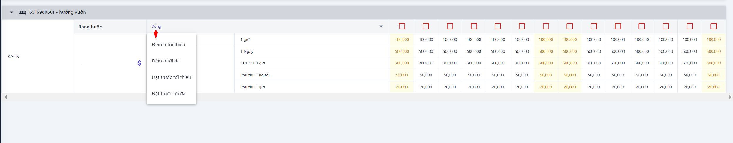 ![]() (3) Các ràng buộc: Hiển thị thông tin các ràng buộc về loại giá, nhấp vào chữ “Đóng” hoặc biểu tượng :thả: để chọn các ràng buộc muốn xem. Xem chi tiết các ràng buộc ở phần Chính sách ràng buộc ![]() (4) Trong trường hợp các ràng buộc được bật lên,hệ thống sẽ thể hiện như hình bên dưới có nghĩa loại giá RACK sẽ đóng từ ngày 9 đến ngày 14 tháng 10, khách hàng sẽ không thể đặt phòng với loại giá này trong thời gian trên ![]() |