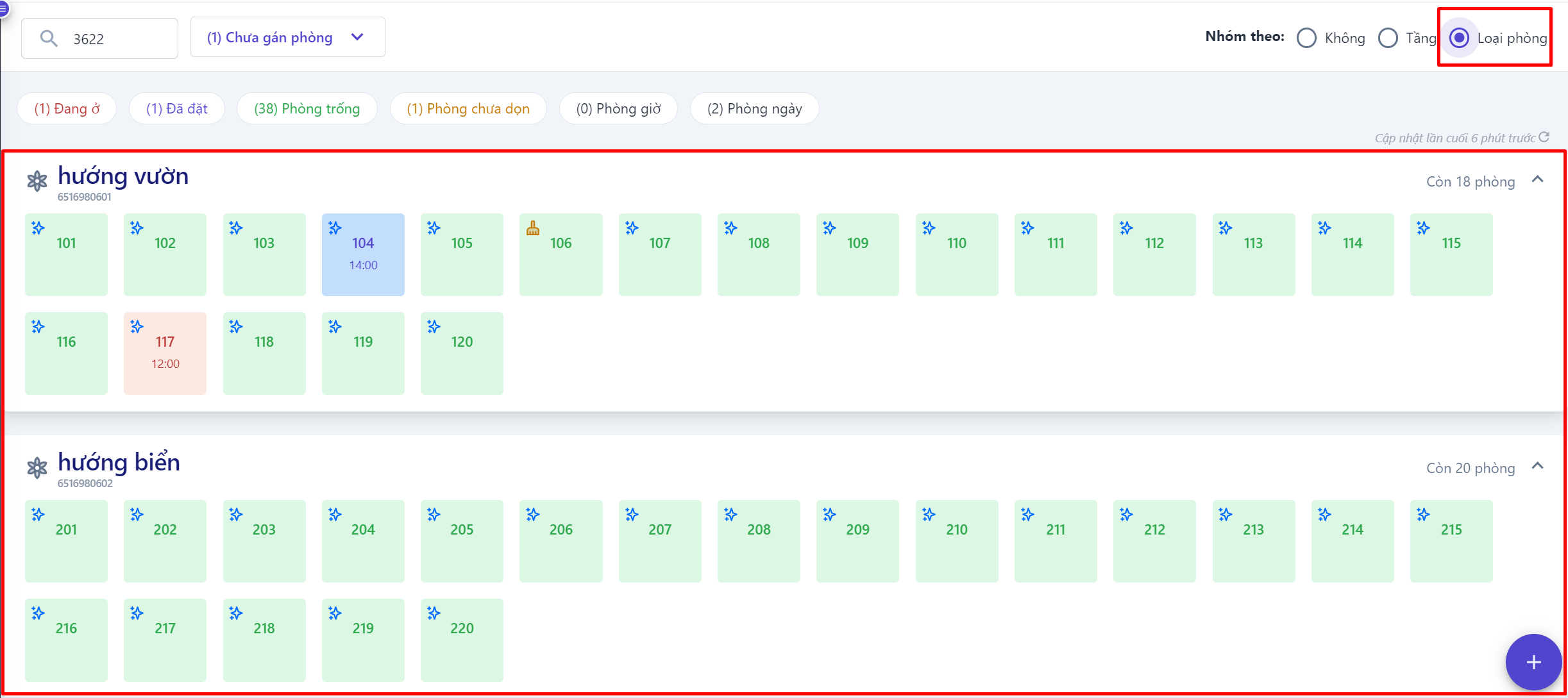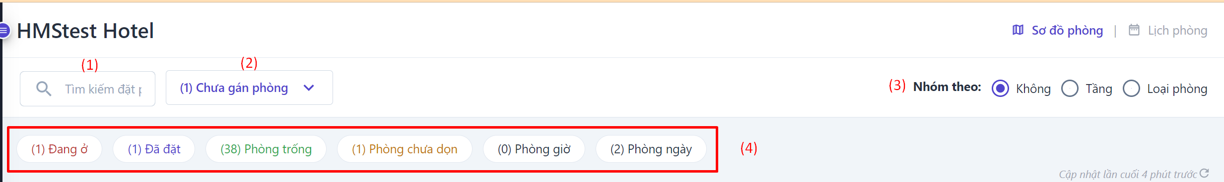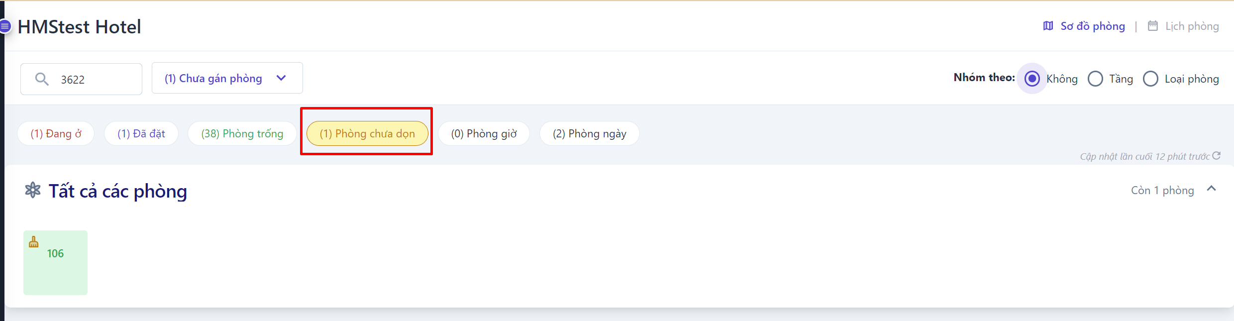 I. Sơ đồ phòng![]() (1) Tìm kiếm đặt phòng: Người dùng có thể tìm kiếm đặt phòng nhanh bằng cách nhập mã hành trình, mã xác nhận, số phòng.. (2) Chưa gán phòng: Nhấp vào ô chưa gán phòng để xem thông tin các đặt phòng sẽ đến ngày hôm nay nhưng chưa được gán số phòng ![]() (3) Người dùng có thể chọn xem sơ đồ phòng theo nhóm Tầng hoặc nhóm theo Loại phòng