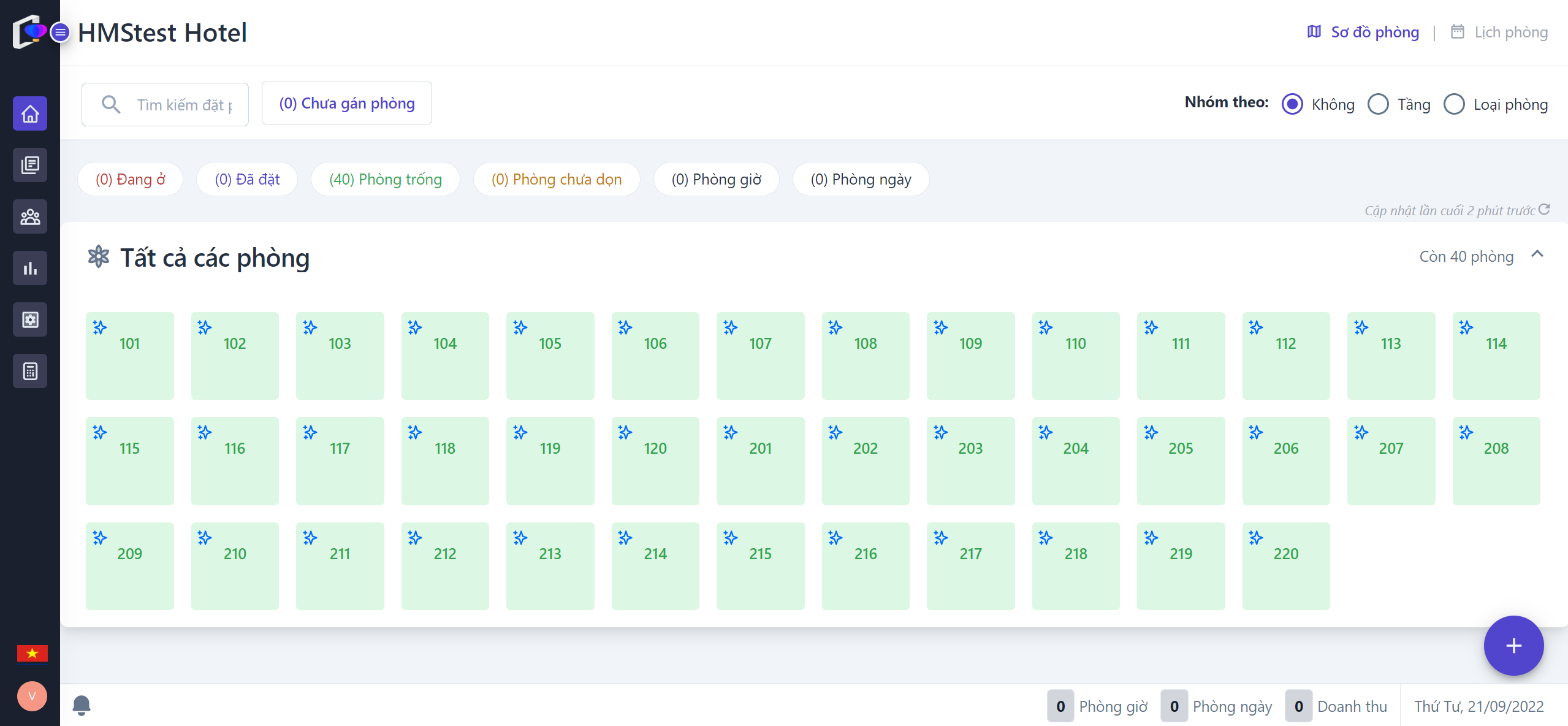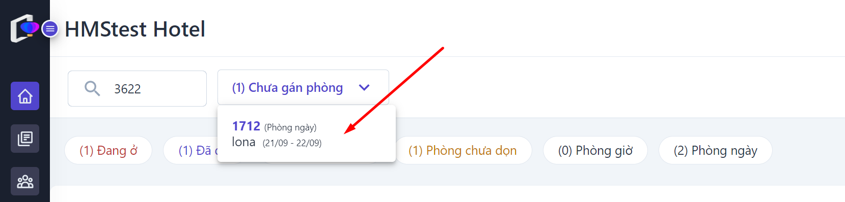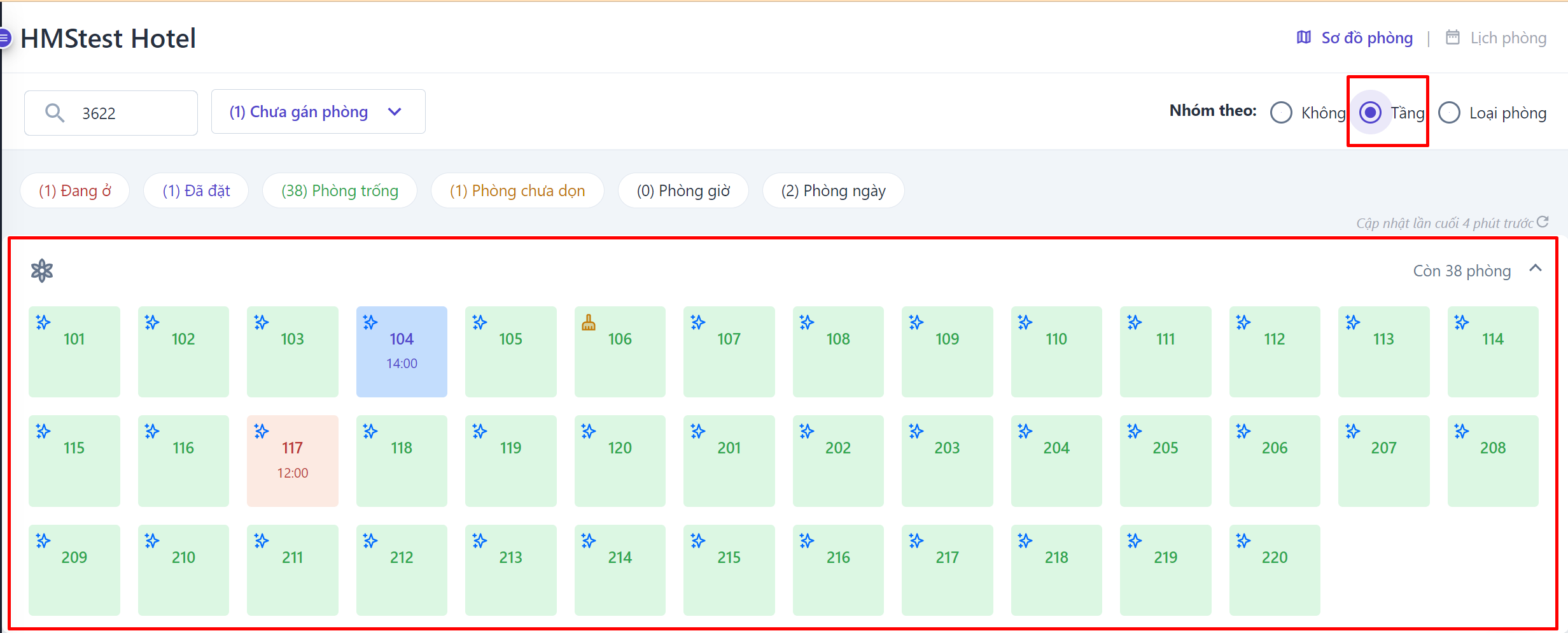 I. Sơ đồ phòng![]() (1) Tìm kiếm đặt phòng: Người dùng có thể tìm kiếm đặt phòng nhanh bằng cách nhập mã hành trình, mã xác nhận, số phòng.. (2) Chưa gán phòng: Nhấp vào ô chưa gán phòng để xem thông tin các đặt phòng sẽ đến ngày hôm nay nhưng chưa được gán số phòng ![]() (3) Người dùng có thể chọn xem sơ đồ phòng theo nhóm Tầng hoặc nhóm theo Loại phòng