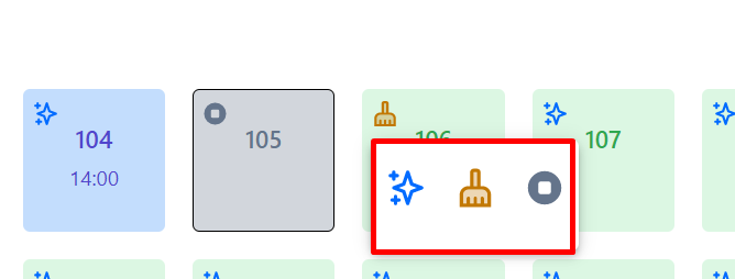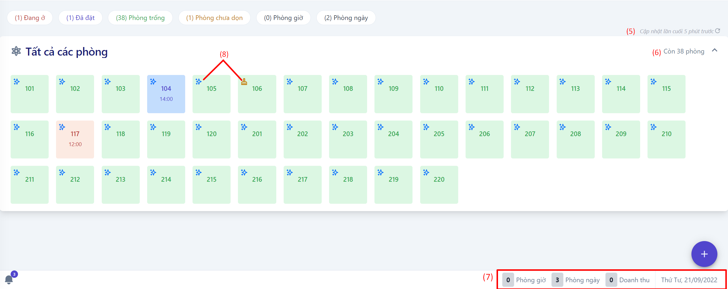 ![]() (5) Người dùng chọn vào biểu tượng :refresh: làm mới màn hình sơ đồ phòng (6) Hiển thị thông tin số phòng còn trống (7) Hiển thị thông tin số phòng đang bán theo giờ/ theo ngày và tổng số doanh thu trong ngày (8) Thay đổi tình trạng phòng: Trên mỗi số phòng sẽ hiển thị biểu tượng phòng sạch, dơ hoặc không khả dụng ![]()
