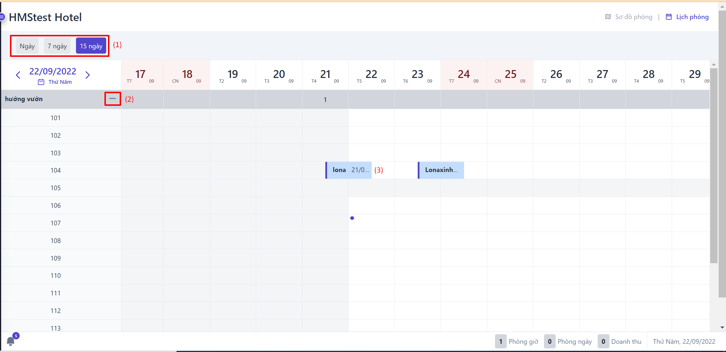 II. Lịch phòng![]() (1) Chọn xem lịch phòng theo 1 ngày, 7 ngày hoặc 15 ngày (2) Hệ thống hiển thị toàn bộ thông tin số phòng theo từng loai phòng, để ẩn bớt số phòng, người dùng chọn vào dấu – để thao tác ẩn hoặc chọn dấu + để hiển thị toàn bộ danh sách số phòng (3) Hệ thống hiển thị thông tin các đặt phòng theo ngày giúp người dùng kiểm soát và quản lý thuận tiện hơn |